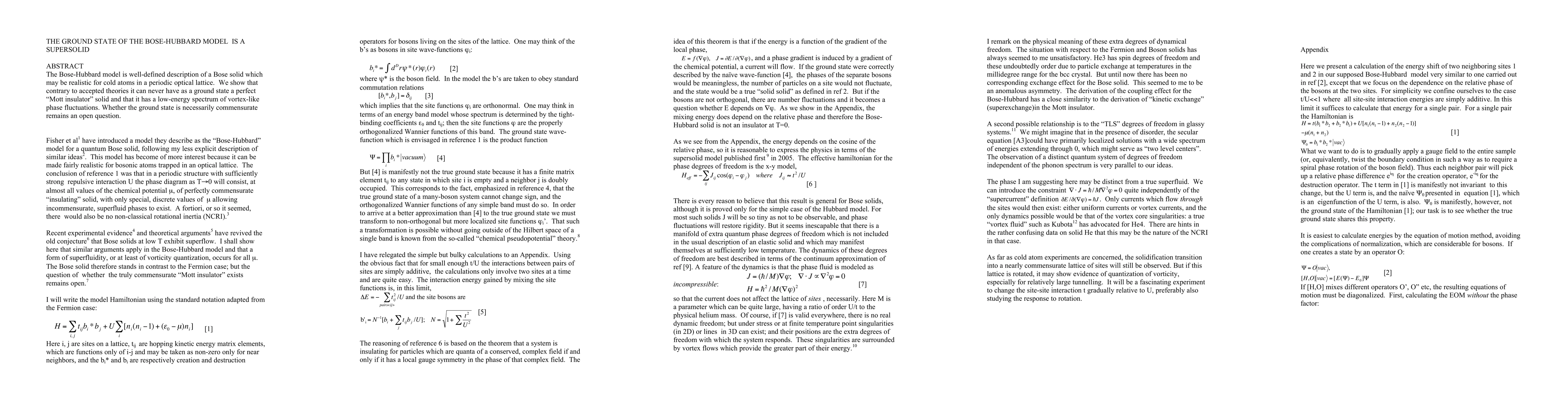 The Bose-Hubbard model, a standard description for Bose solids in optical lattices, reveals a ground state that is not a perfect Mott insulator but rather a supersolid with vortex-like phase fluctuations, challenging existing theories. The exact nature of the ground state's commensurability remains unresolved.