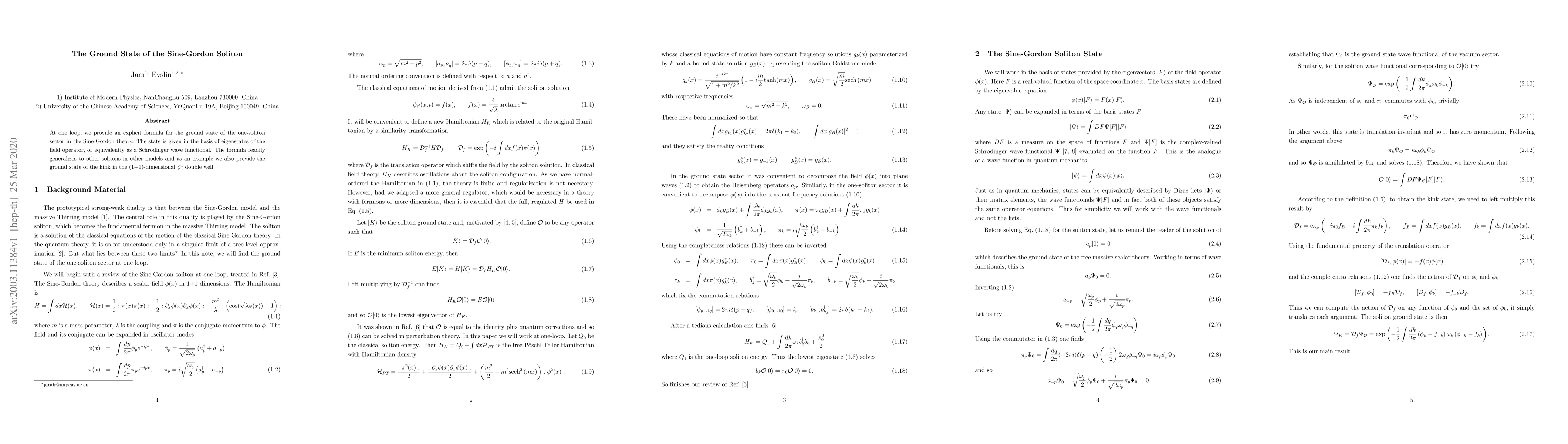 Researchers found an explicit formula for the ground state of a soliton in the Sine-Gordon theory, which can be applied to other models and also describes the ground state of a kink in another model.