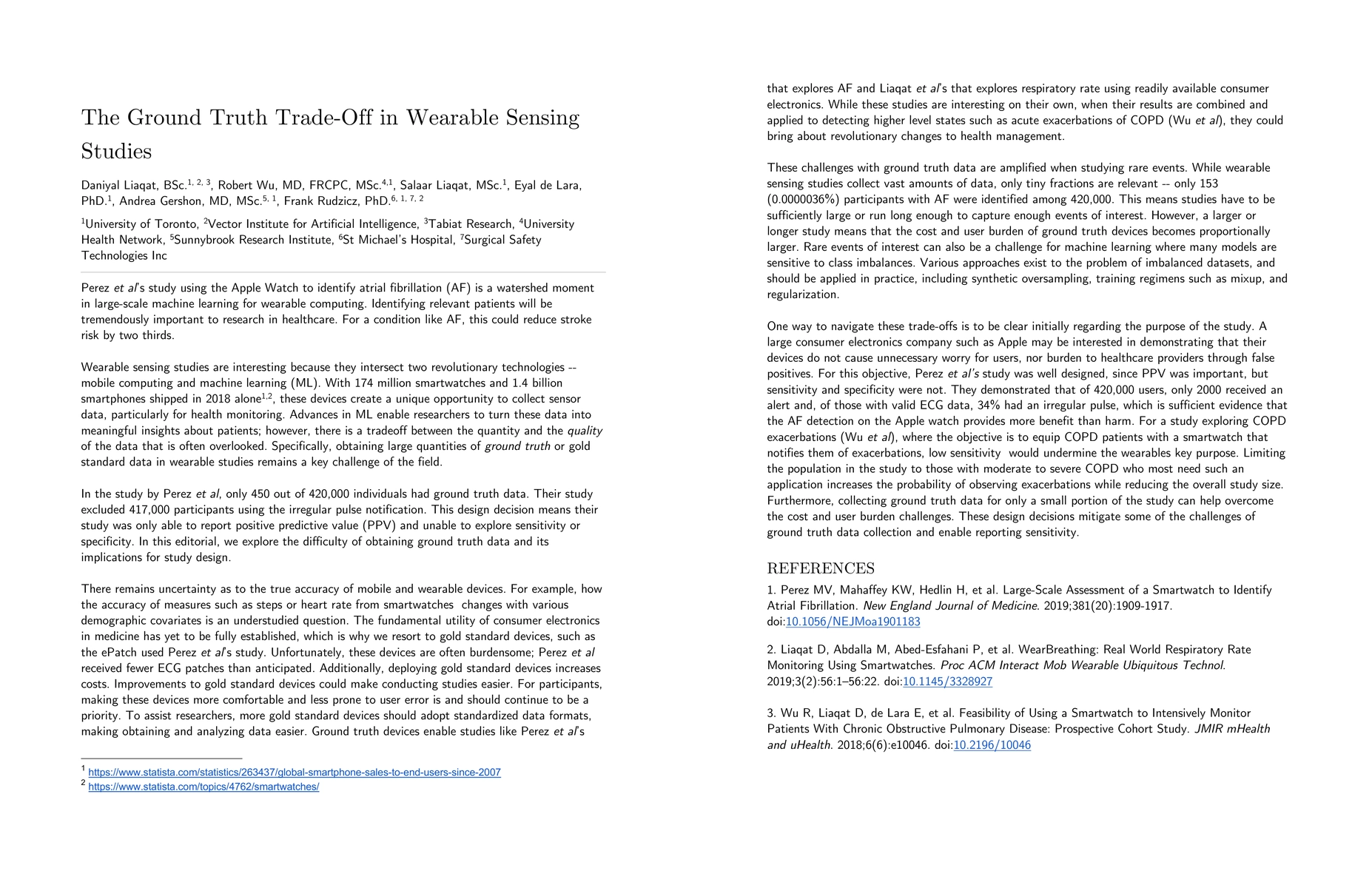 Perez et al's study using the Apple Watch to identify atrial fibrillation (AF) is a watershed moment in large-scale machine learning for wearable computing. Identifying relevant patients will be tremendously important to research in healthcare. For a condition like AF, this could reduce stroke risk by two thirds. In the study by Perez et al, only 450 out of 420,000 individuals had ground truth data. Their study excluded 417,000 participants using the irregular pulse notification. This design decision means their study was only able to report positive predictive value (PPV) and unable to explore sensitivity or specificity. In this editorial, we explore the difficulty of obtaining ground truth data and its implications for study design.