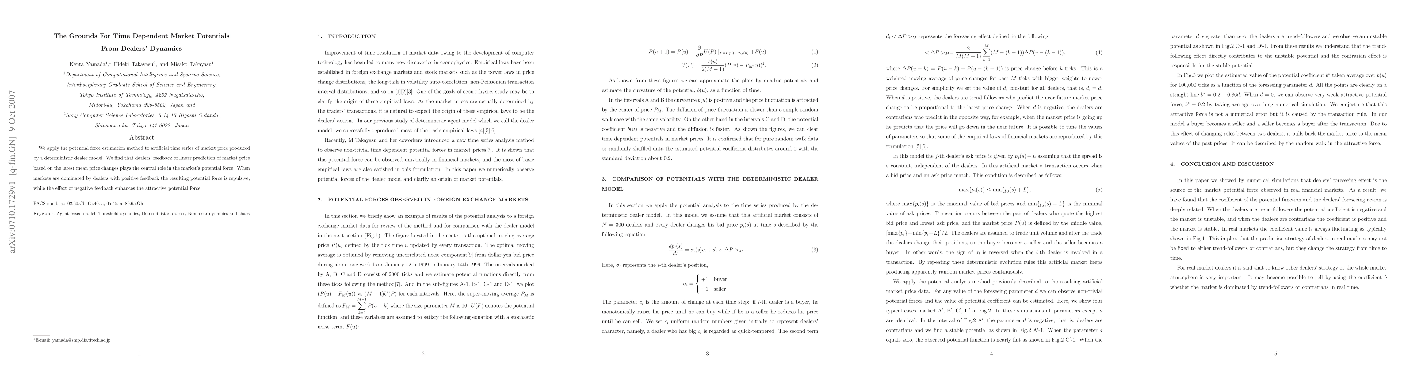 Researchers found that dealers' feedback on market price predicts repulsive forces when positive, but attractive forces when negative, shaping the market's potential energy.