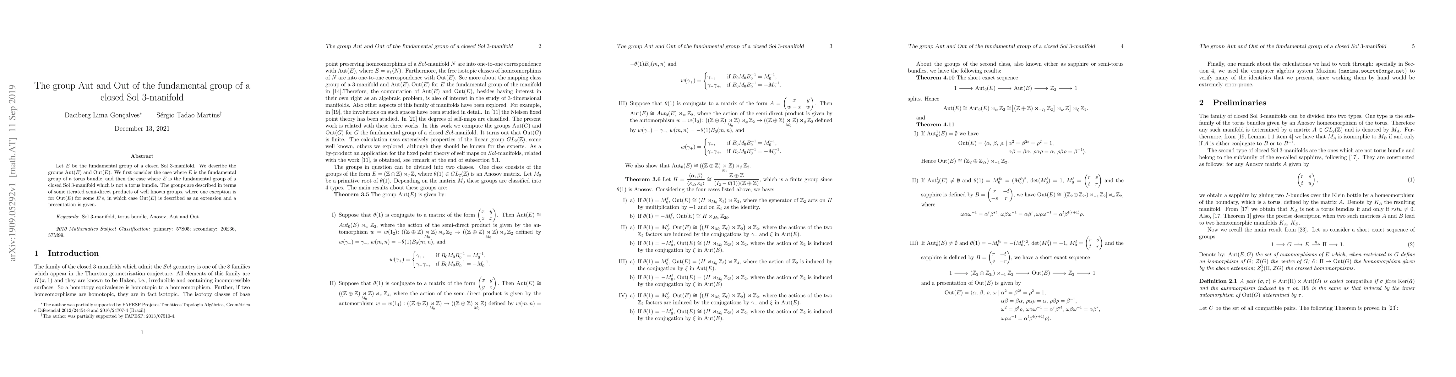 This paper investigates the automorphism and outer automorphism groups of the fundamental group $E$ of a closed Sol 3-manifold, detailing their structures through iterated semi-direct products and extensions, with specific presentations for certain cases.