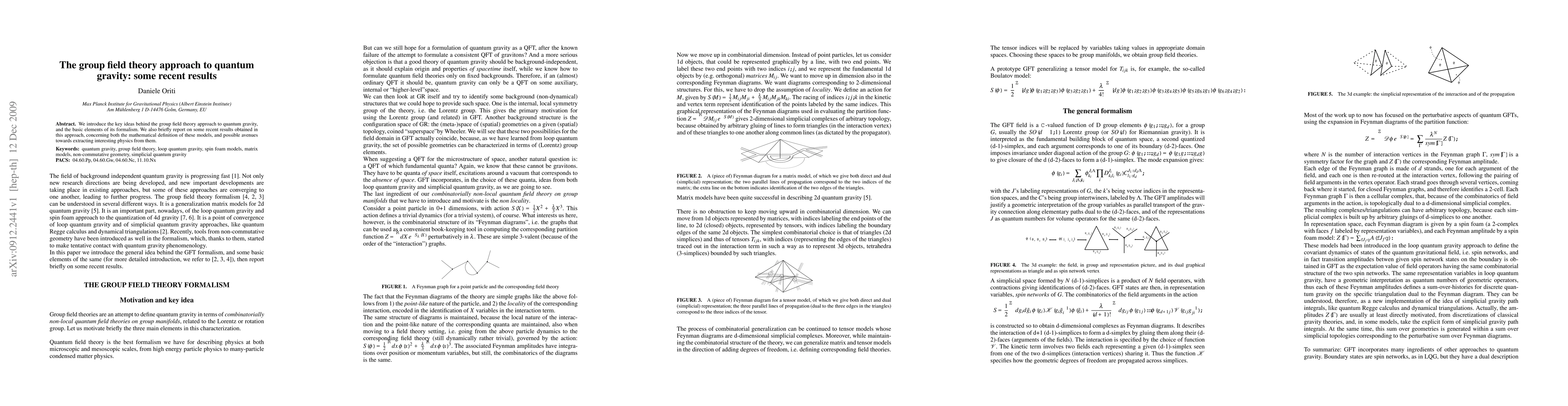We introduce the key ideas behind the group field theory approach to quantum gravity, and the basic elements of its formalism. We also briefly report on some recent results obtained in this approach, concerning both the mathematical definition of these models, and possible avenues towards extracting interesting physics from them.
