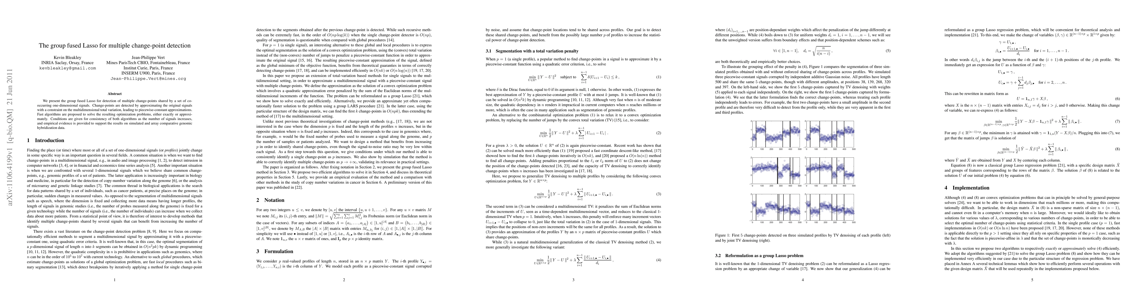 The group fused Lasso method is introduced for detecting multiple change-points shared across co-occurring one-dimensional signals by minimizing multidimensional total variation. The approach employs fast algorithms for optimization, ensuring consistency as the number of signals grows, and is validated through simulations and genomic data analysis.