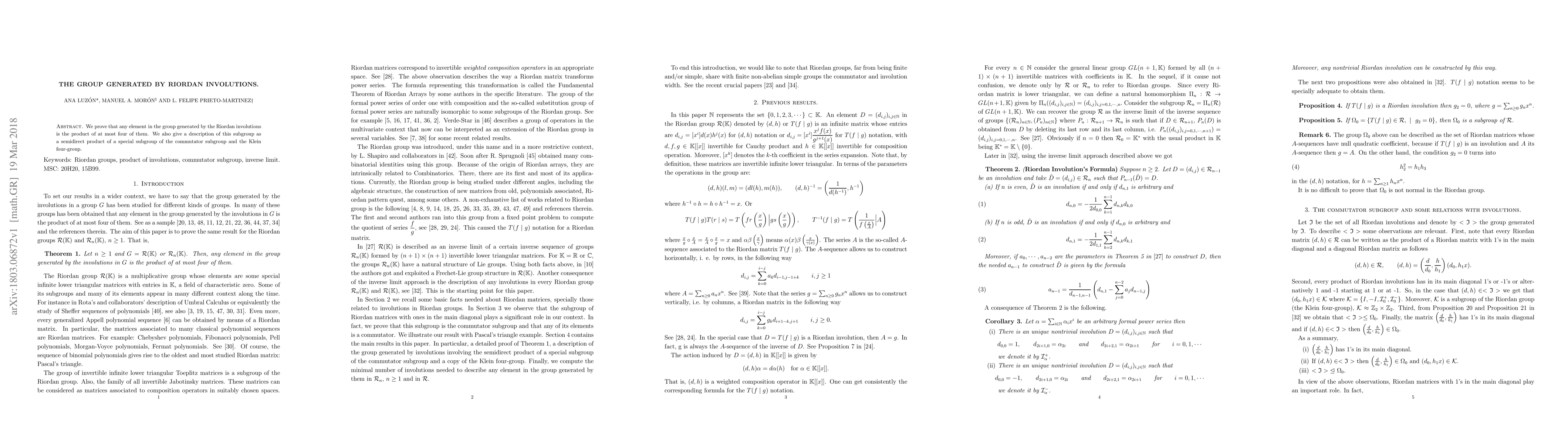 We prove that any element in the group generated by the Riordan involutions is the product of at most four of them. We also give a description of this subgroup as a semidirect product of a special subgroup of the commutator subgroup and the Klein four-group.