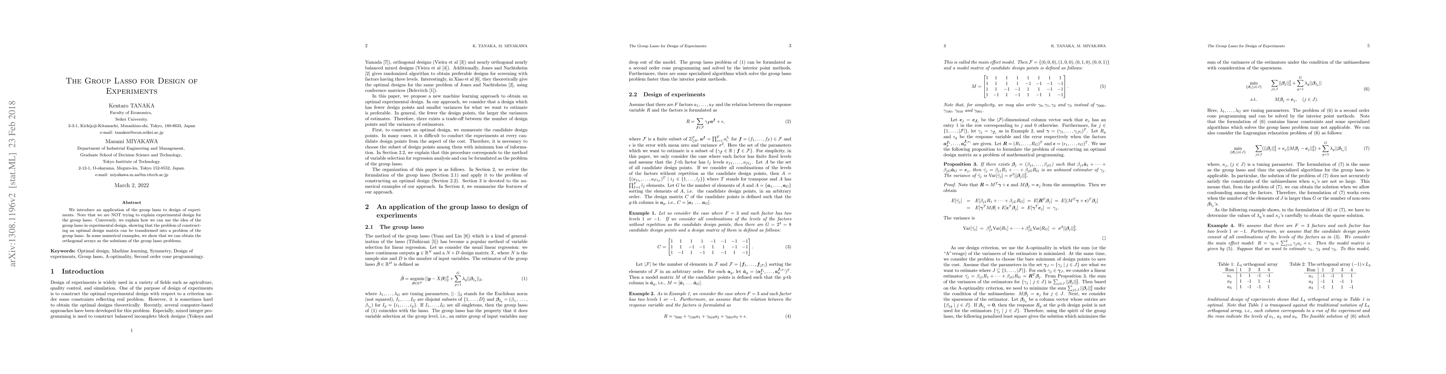 This paper applies the group lasso method to optimize experimental design, transforming the construction of an optimal design matrix into a group lasso problem, and demonstrates through examples that it can yield orthogonal arrays as solutions.