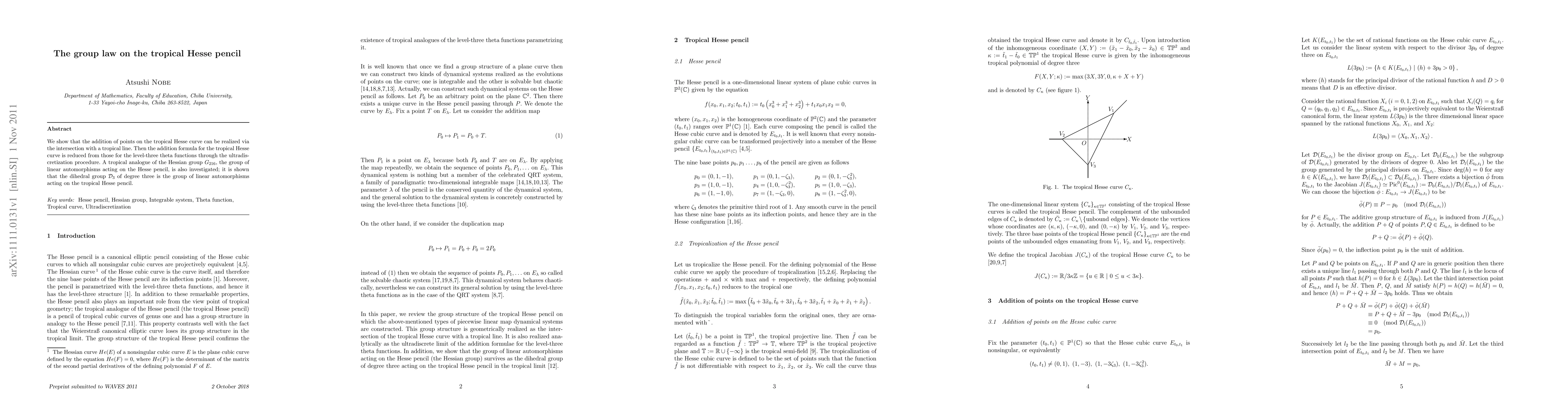 The paper demonstrates how point addition on the tropical Hesse curve is realized through intersections with tropical lines, and derives the addition formula via the ultradiscretization of level-three theta functions. It also explores the tropical Hessian group, revealing that it is isomorphic to the dihedral group of degree three.
