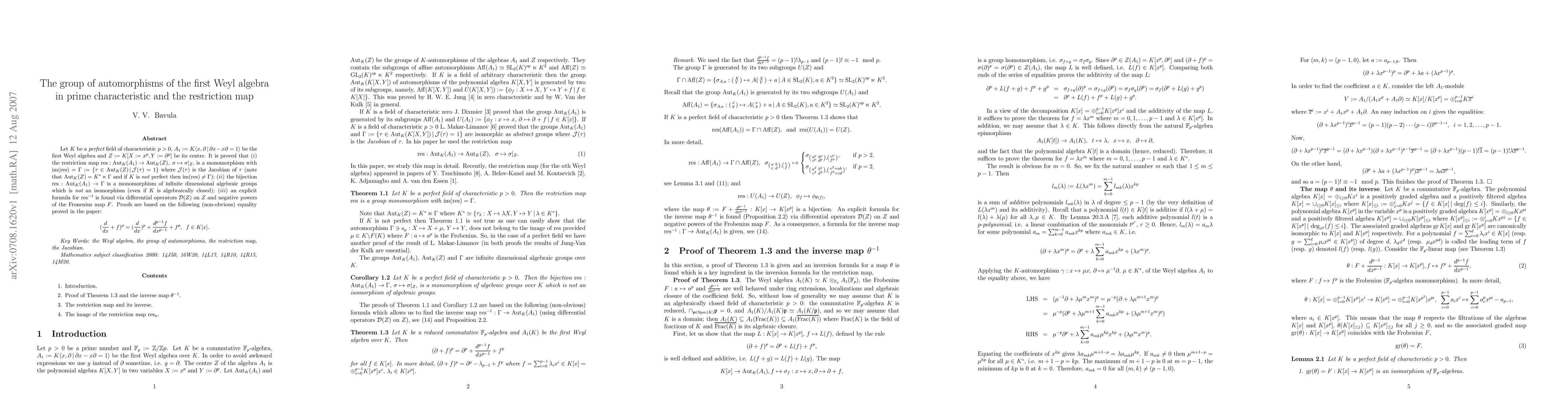 Let $K$ be a {\em perfect} field of characteristic $p>0$, $A_1:=K< x, \der | \der x- x\der =1>$ be the first Weyl algebra and $Z:=K[X:=x^p, Y:=\der^p]$ be its centre. It is proved that $(i)$ the restriction map $\res :\Aut_K(A_1)\ra \Aut_K(Z), \s \mapsto \s|_Z$, is a monomorphism with $\im (\res) = \G :=\{\tau \in \Aut_K(Z) | \CJ (\tau) =1\}$ where $\CJ (\tau) $ is the Jacobian of $\tau$ (note that $\Aut_K(Z)=K^*\ltimes \G$ and if $K$ is {\em not} perfect then $\im (\res) \neq \G$); $(ii)$ the bijection $\res : \Aut_K(A_1) \ra \G$ is a monomorphism of infinite dimensional algebraic groups which is {\em not} an isomorphism (even if $K$ is algebraically closed); $(iii)$ an explicit formula for $\res^{-1}$ is found via differential operators $\CD (Z)$ on $Z$ and negative powers of the Fronenius map $F$. Proofs are based on the following (non-obvious) equality proved in the paper: $$ (\frac{d}{dx}+f)^p= (\frac{d}{dx})^p+\frac{d^{p-1}f}{dx^{p-1}}+f^p, f\in K[x].$$