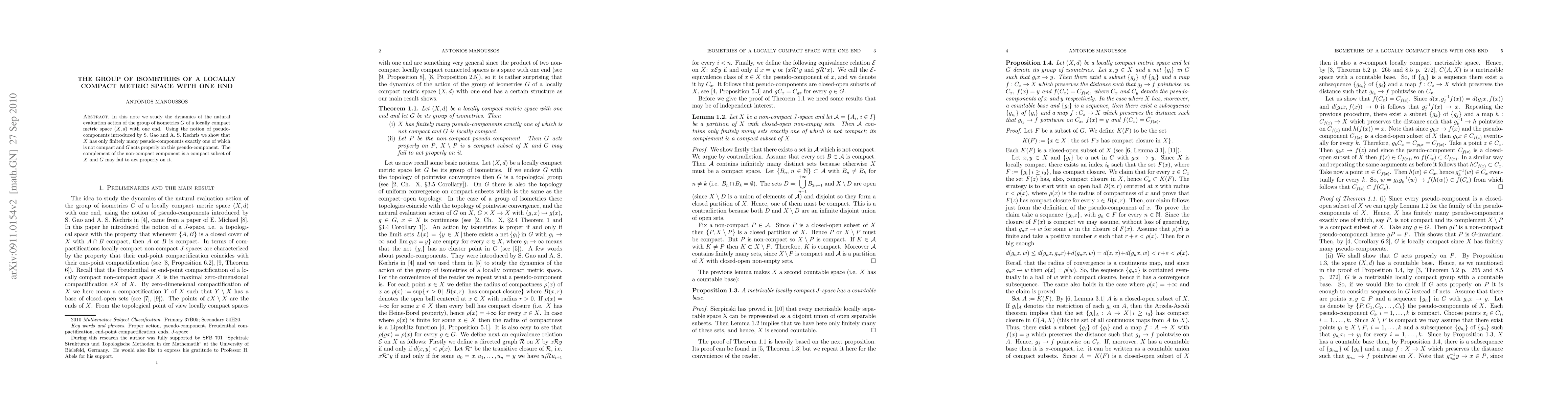 In this note we study the dynamics of the natural evaluation action of the group of isometries $G$ of a locally compact metric space $(X,d)$ with one end. Using the notion of pseudo-components introduced by S. Gao and A. S. Kechris we show that $X$ has only finitely many pseudo-components of which exactly one is not compact and $G$ acts properly on. The complement of the non-compact component is a compact subset of $X$ and $G$ may fail to act properly on it.