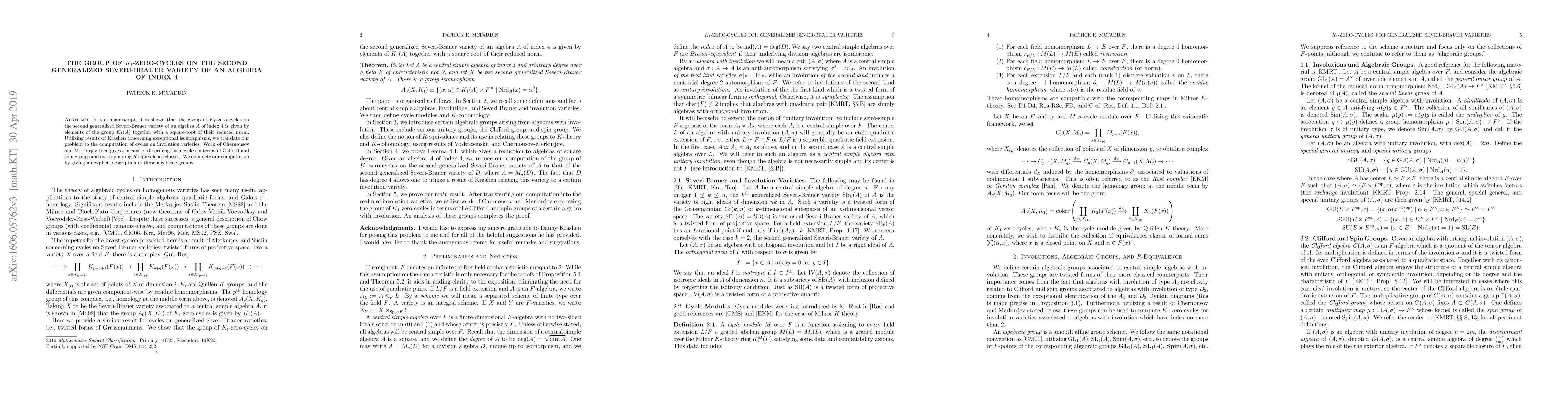 In this manuscript, it is shown that the group of $K_1$-zero-cycles on the second generalized Severi-Brauer variety of an algebra $A$ of index 4 is given by elements of the group $K_1(A)$ together with a square-root of their reduced norm. Utilizing results of Krashen concerning exceptional isomorphisms, we translate our problem to the computation of cycles on involution varieties. Work of Chernousov and Merkurjev then gives a means of describing such cycles in terms of Clifford and spin groups and corresponding $R$-equivalence classes. We complete our computation by giving an explicit description of these algebraic groups.