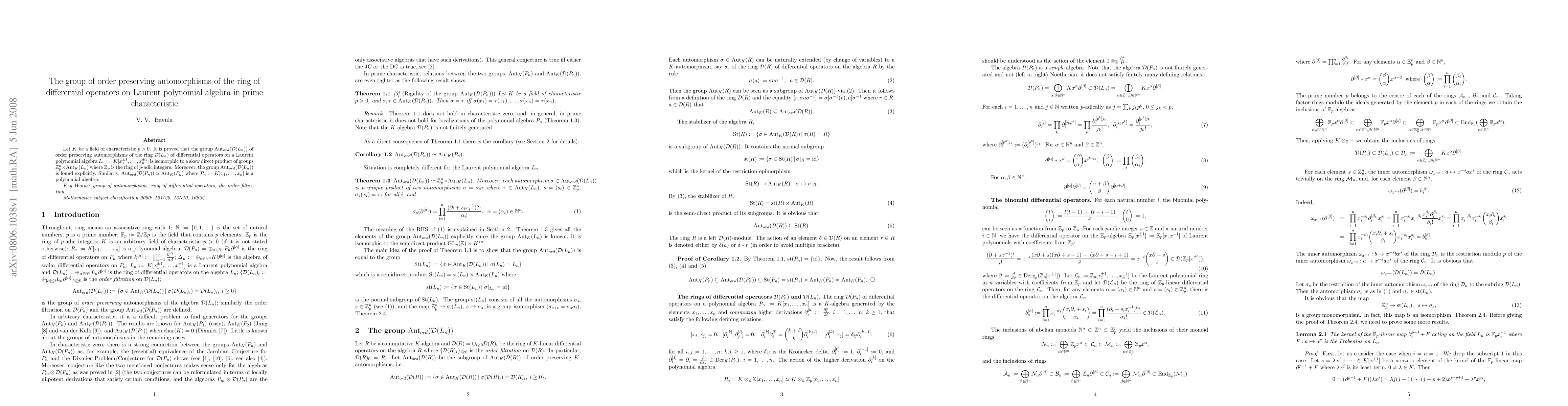 This paper proves that the group of order preserving automorphisms of the ring of differential operators on a Laurent polynomial algebra over a field of prime characteristic is isomorphic to a skew direct product of $\Zp^n$ and $\Aut_K(L_n)$. It also explicitly determines the automorphism group and shows a similar result for polynomial algebras.