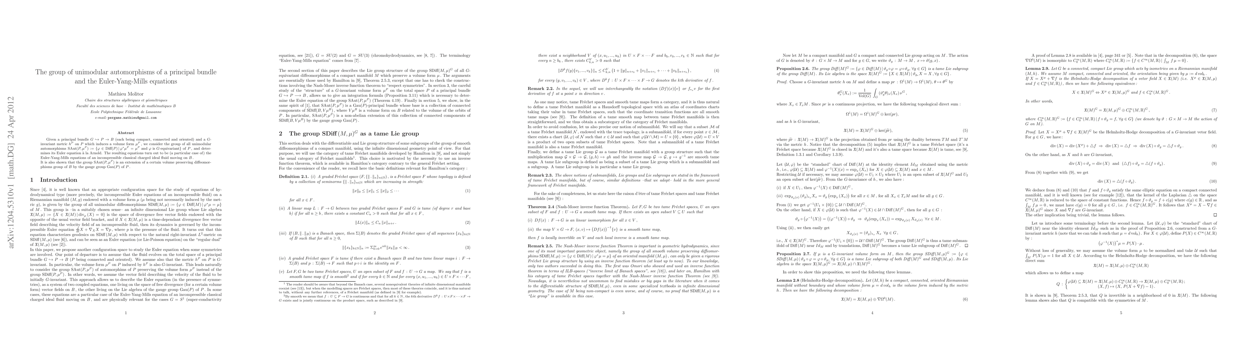 Given a principal bundle G \rightarrow P \rightarrow B (each being compact, connected and oriented) and a G-invariant metric h^{P} on P which induces a volume form \mu^{P}, we consider the group of all unimodular automorphisms SAut(P,\mu^{P}):={\varphi\in Diff(P) | \varphi^{*}\mu^{P}=\mu^{P} and \varphi is G-equivariant} of P and determines its Euler equation a la Arnold. The resulting equations turn out to be (a particular case of) the Euler-Yang-Mills equations of an incompressible classical charged ideal fluid moving on B. It is also shown that the group SAut(P,\mu^{P} is an extension of a certain volume preserving diffeomorphisms group of B by the gauge group Gau(P) of P.