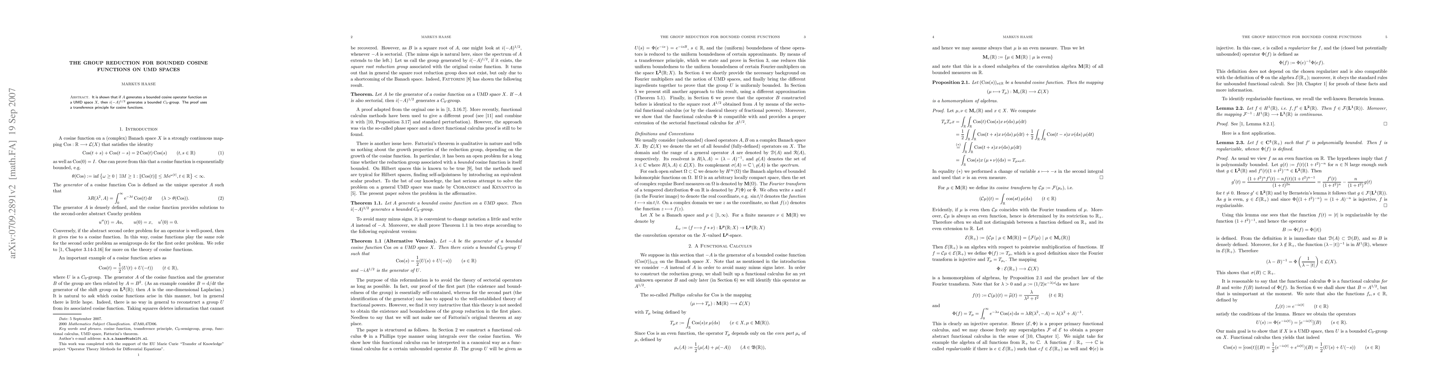Summary: The paper demonstrates that if A generates a bounded cosine operator function on a UMD space X, then i(-A)^{1/2} generates a bounded C_0-group, utilizing a transference principle for cosine functions to establish the result.