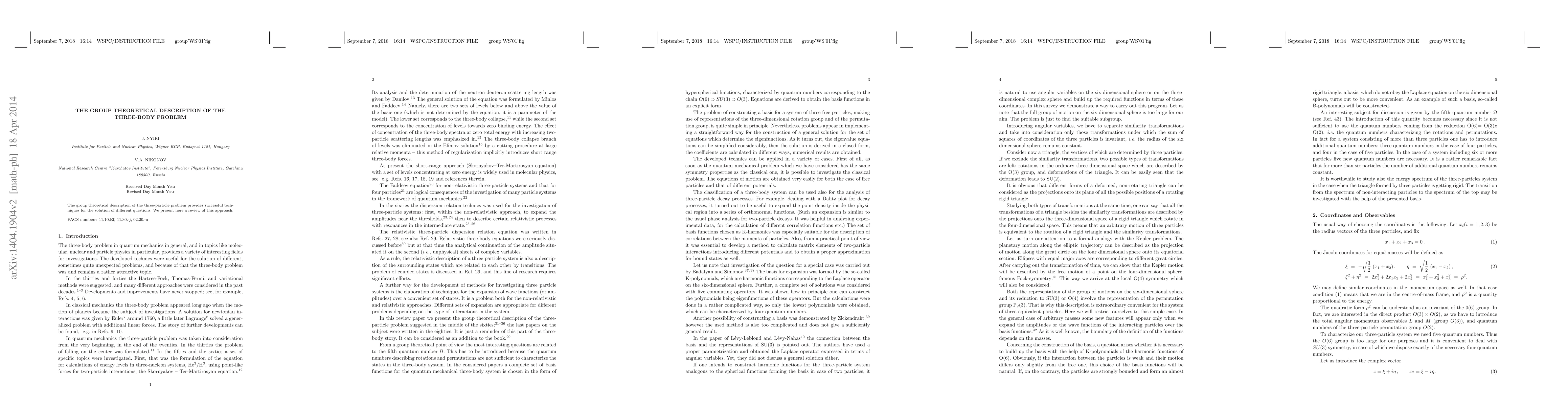 Summary: This paper reviews the application of group theory to solve the three-body problem, highlighting successful techniques and methodologies derived from this mathematical approach. The focus is on the theoretical framework and its practical implications in physics.