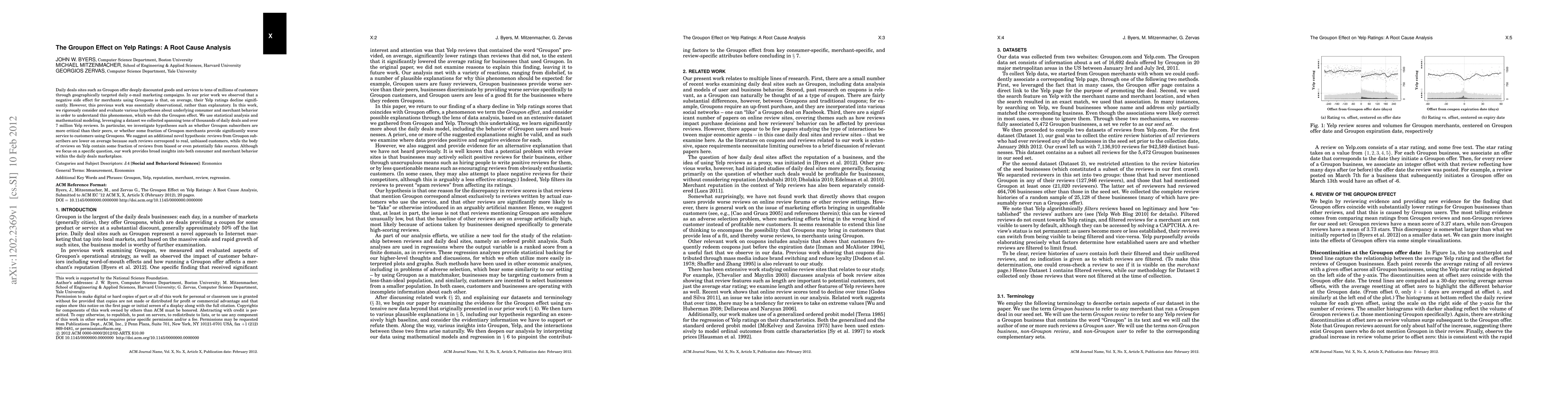 This study investigates the "Groupon effect," where merchants using Groupon experience a decline in Yelp ratings. It explores various hypotheses, including whether Groupon subscribers are more critical or if merchants provide worse service to Groupon customers, and suggests that lower Yelp ratings may reflect genuine customer feedback amidst a mix of biased reviews.