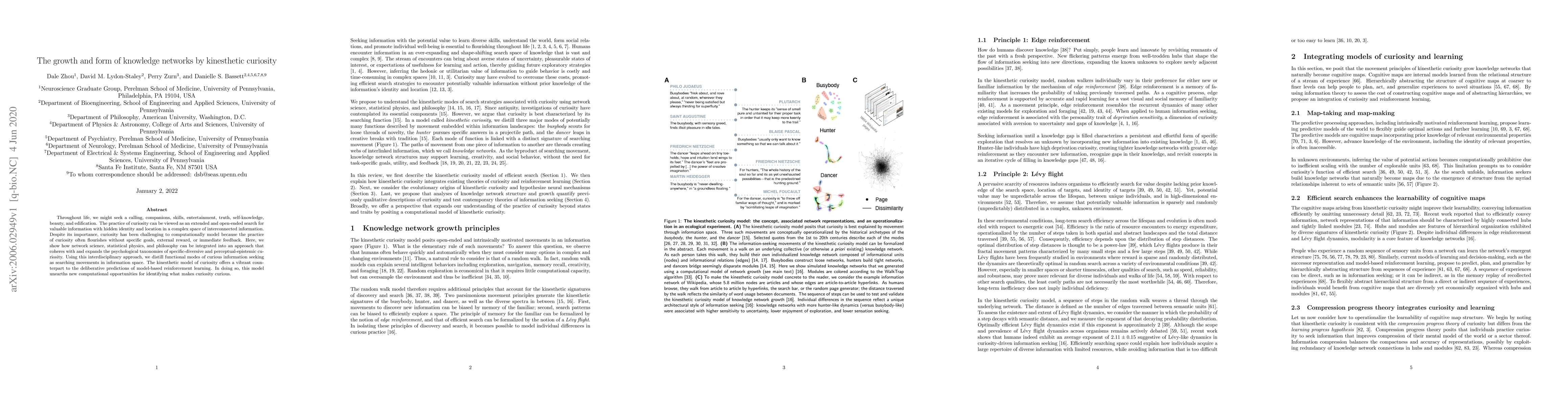 This paper integrates network science, statistical physics, and philosophy to model curiosity as kinesthetic curiosity, proposing that curiosity can be seen as searching movements in information space. The kinesthetic model contrasts with traditional model-based reinforcement learning, offering new computational insights into the nature of curiosity.