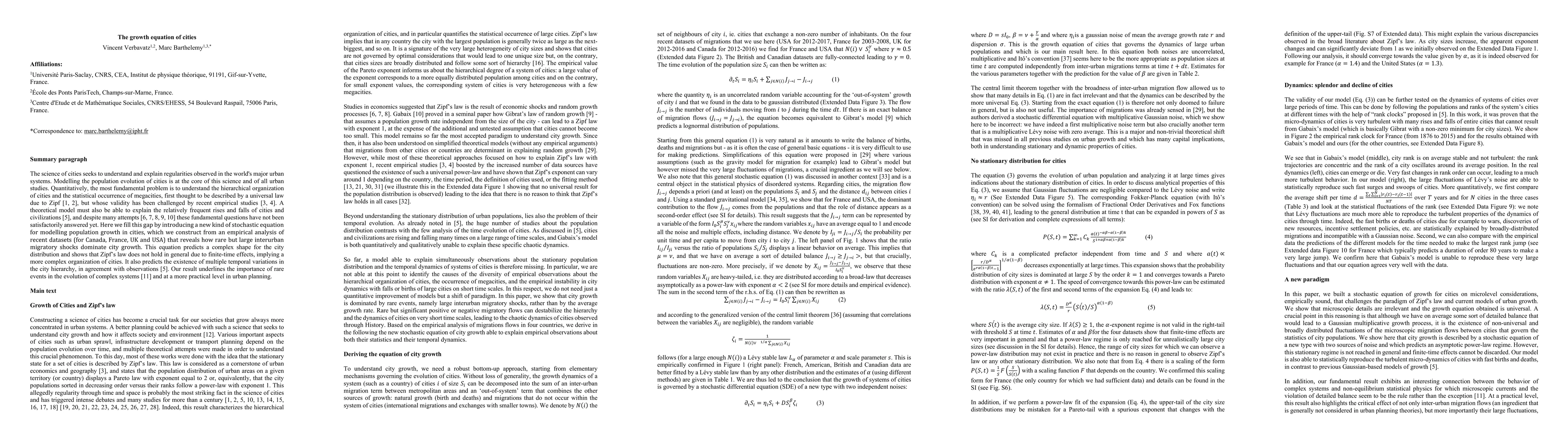 A new stochastic equation models city population growth, predicting complex city distributions and multiple temporal variations in the hierarchy, contradicting Zipf's law due to rare but large interurban migratory shocks.