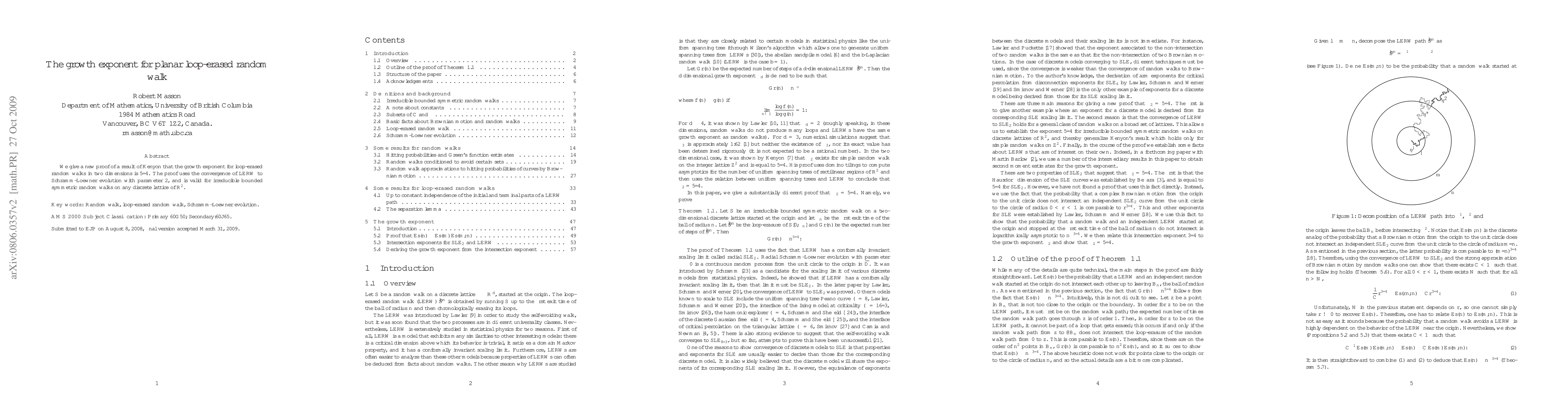 Summary: This paper provides a new proof for Kenyon's result that the growth exponent for planar loop-erased random walks is 5/4, utilizing the convergence to Schramm-Loewner evolution with parameter 2, applicable to any two-dimensional discrete lattice.