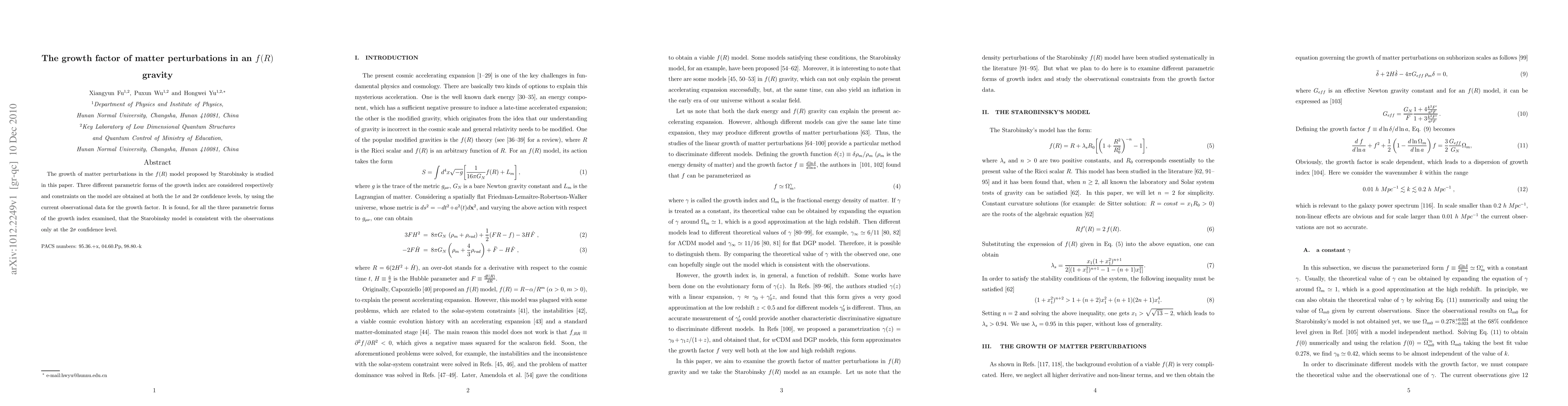 This paper investigates the growth of matter perturbations in the Starobinsky $f(R)$ gravity model, examining three forms of the growth index. It finds that the model aligns with observational data only at the $2\sigma$ confidence level, indicating potential discrepancies at the $1\sigma$ level.