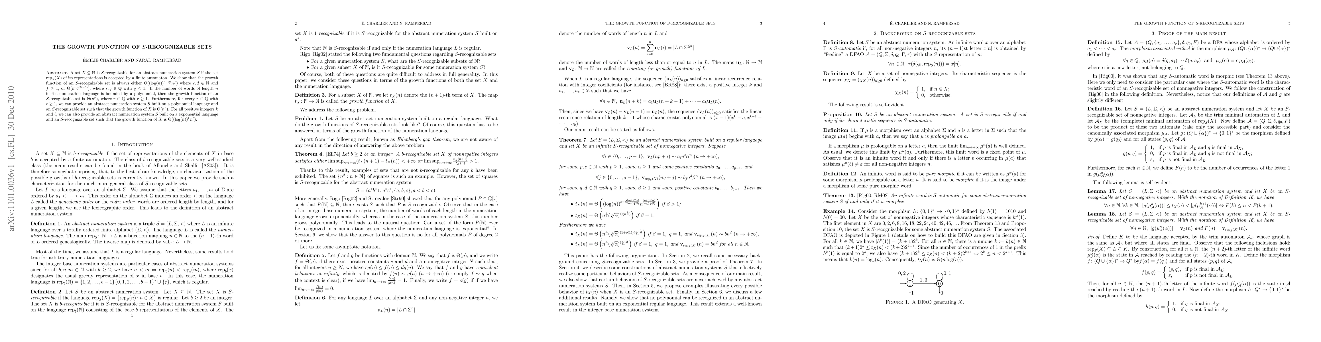 This paper investigates the growth function of S-recognizable sets, showing that it follows either a polynomial or exponential form. It demonstrates that under specific conditions, the growth function can be precisely determined and constructed for various rational exponents.