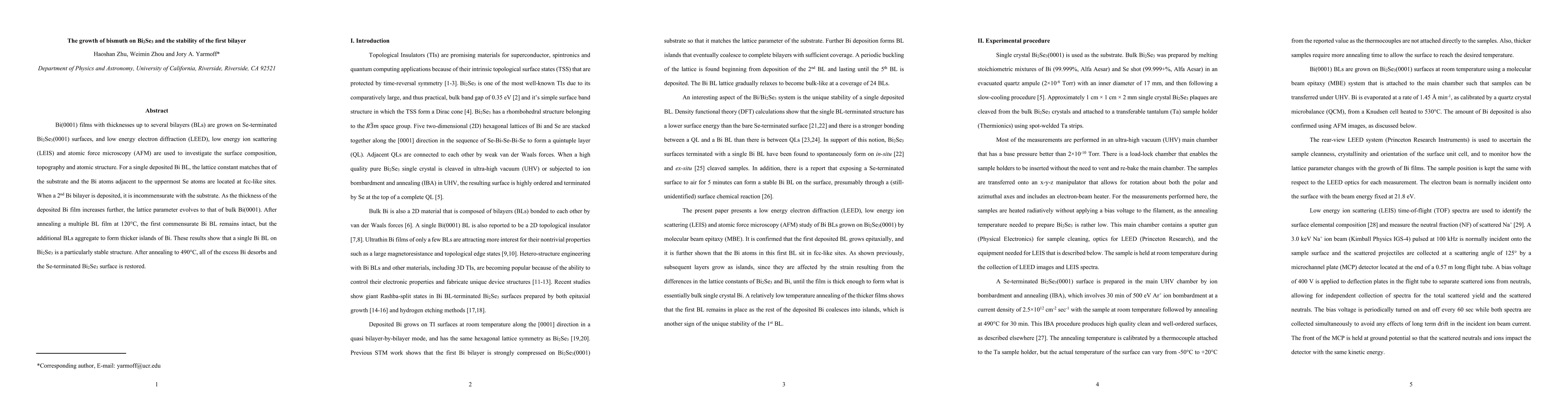 Bi(0001) films with thicknesses up to several bilayers (BLs) are grown on Se-terminated Bi$_2$Se$_3$(0001) surfaces, and low energy electron diffraction (LEED), low energy ion scattering (LEIS) and atomic force microscopy (AFM) are used to investigate the surface composition, topography and atomic structure. For a single deposited Bi BL, the lattice constant matches that of the substrate and the Bi atoms adjacent to the uppermost Se atoms are located at fcc-like sites. When a 2nd Bi bilayer is deposited, it is incommensurate with the substrate. As the thickness of the deposited Bi film increases further, the lattice parameter evolves to that of bulk Bi(0001). After annealing a multiple BL film at 120{\deg}C, the first commensurate Bi BL remains intact, but the additional BLs aggregate to form thicker islands of Bi. These results show that a single Bi BL on Bi$_2$Se$_3$ is a particularly stable structure. After annealing to 490{\deg}C, all of the excess Bi desorbs and the Se-terminated Bi$_2$Se$_3$ surface is restored.