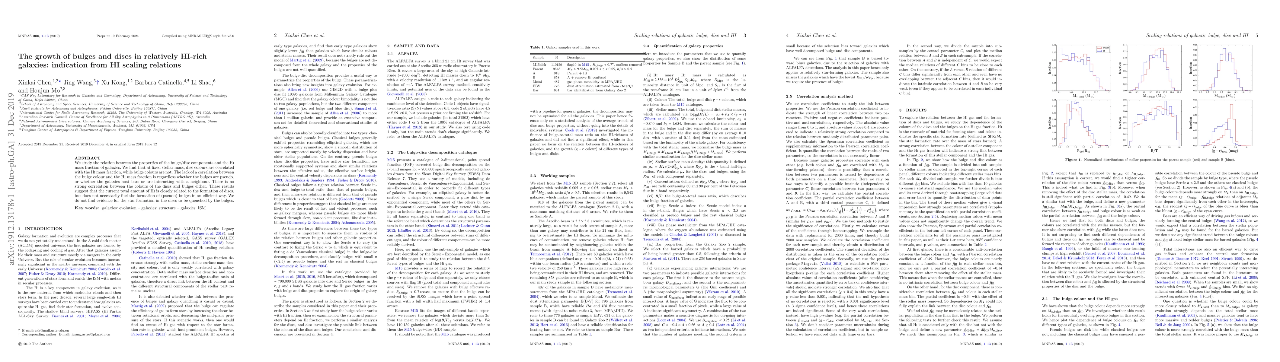 We study the relation between the properties of the bulge/disc components and the HI mass fraction of galaxies. We find that at fixed stellar mass, disc colours are correlated with the HI mass fraction, while bulge colours are not. The lack of a correlation between the bulge colour and the HI mass fraction is regardless whether the bulges are pseudo, or whether the galaxies host bars or are interacting with a neighbour. There is no strong correlation between the colours of the discs and bulges either. These results suggest that the current total amount of HI is closely related to the formation of discs, but does not necessarily fuel the formation of (pseudo) bulges in an efficient way. We do not find evidence for the star formation in the discs to be quenched by the bulges.