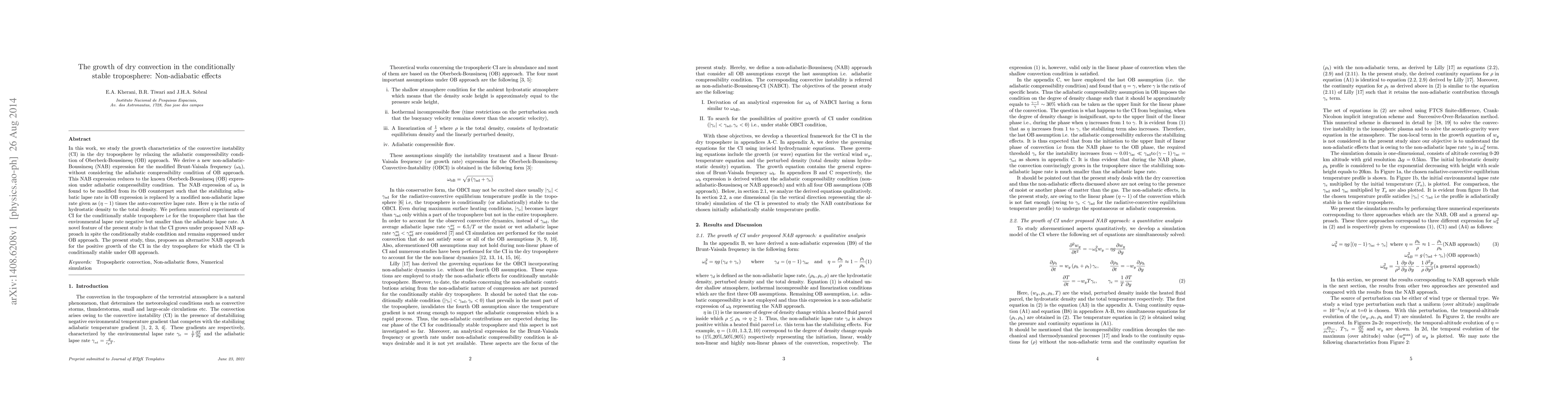 This paper develops a non-adiabatic-Boussinesq (NAB) expression for the modified Brunt-Vaisala frequency, replacing the adiabatic lapse rate with a non-adiabatic lapse rate, and shows that convective instability can grow under conditionally stable tropospheric conditions using this new approach, contrary to the Oberbeck-Boussinesq (OB) method.