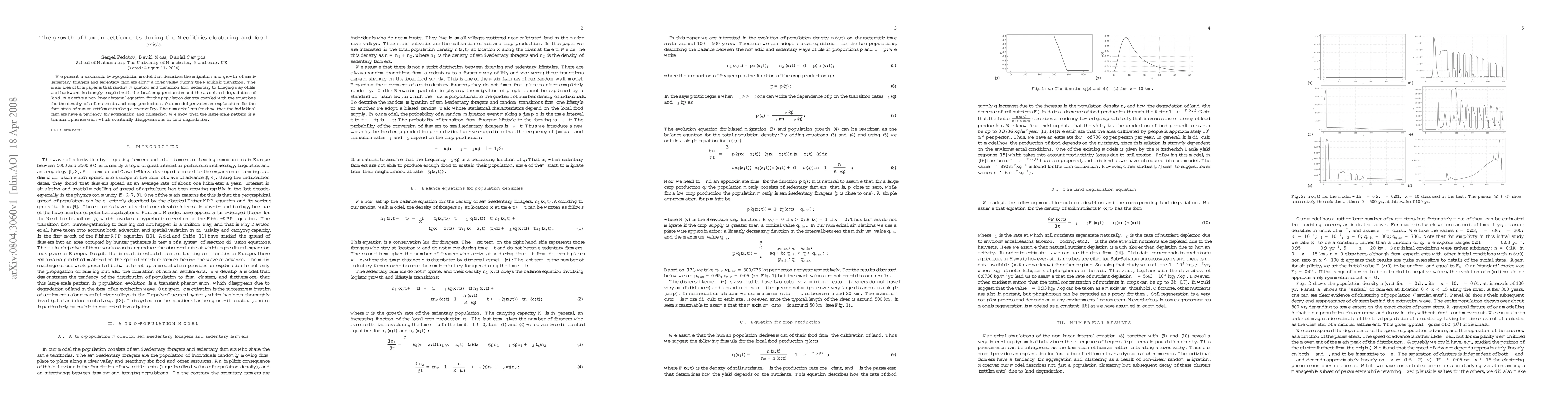 We present a stochastic two-population model that describes the migration and growth of semi-sedentary foragers and sedentary farmers along a river valley during the Neolithic transition. The main idea of this paper is that random migration and transition from sedentary to foraging way of life and backward is strongly coupled with the local crop production and the associated degradation of land. We derive a non-linear integral equation for the population density coupled with the equations for the density of soil nutrients and crop production. Our model provides an explanation for the formation of human settlements along a river valley. The numerical results show that the individual farmers have a tendency for aggregation and clustering. We show that the large-scale pattern is a transient phenomenon which eventually disappears due to land degradation.