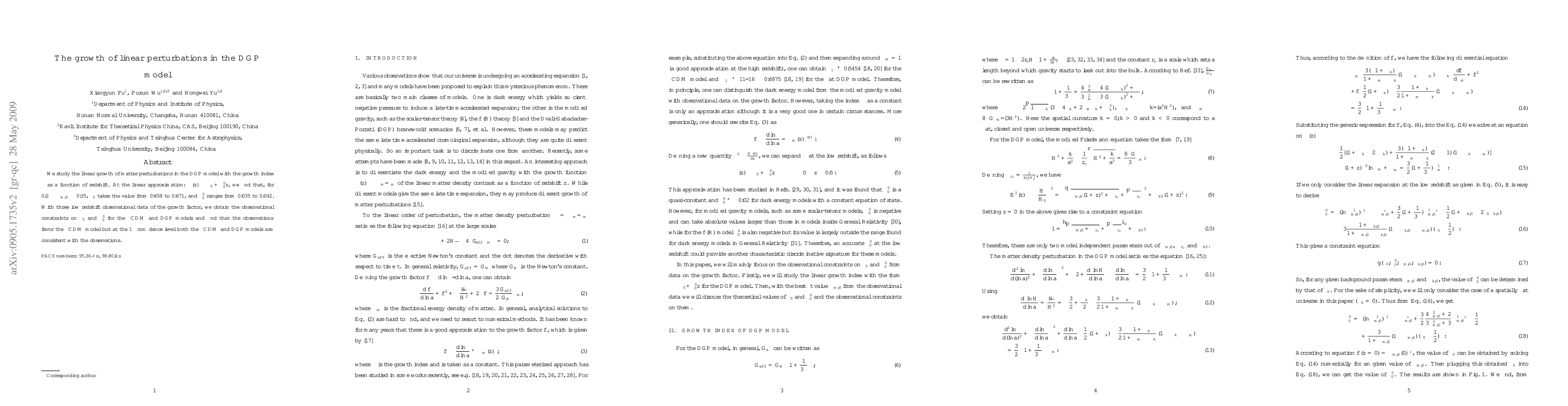 The paper studies linear perturbations in the DGP model, finding that observations favor the λ CDM model at a 1´ confidence level, with both models consistent within error margins.