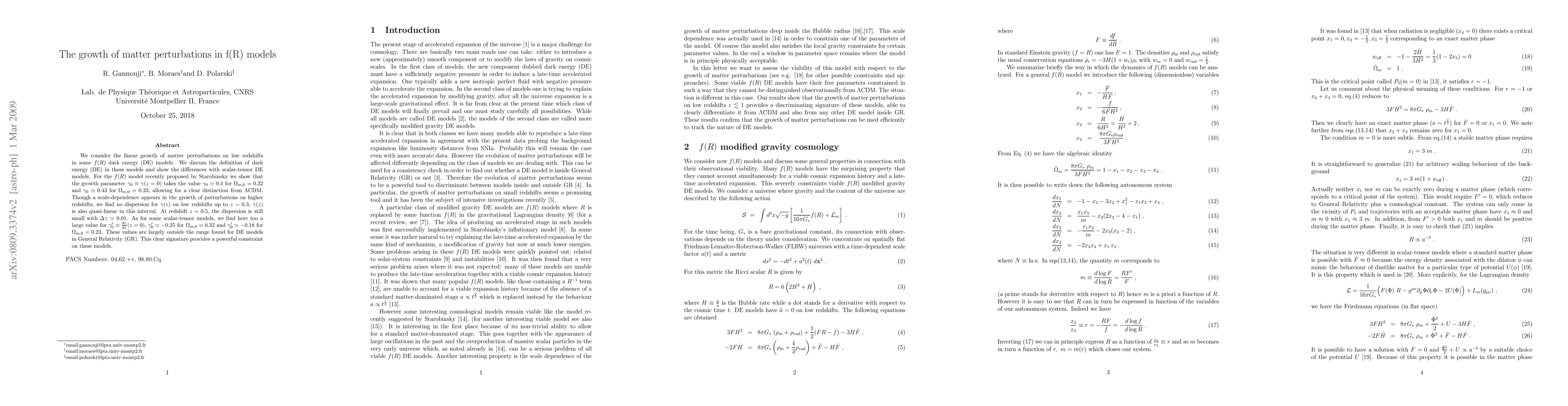 This paper investigates the growth of matter perturbations in $f(R)$ dark energy models, finding that the growth parameter $\gamma_0$ significantly differs from $\Lambda$CDM, especially for $\Omega_{m,0}=0.32$ and $0.23$. It also highlights a large derivative $\gamma'_0$ at $z=0$, indicating a distinct signature from General Relativity models.