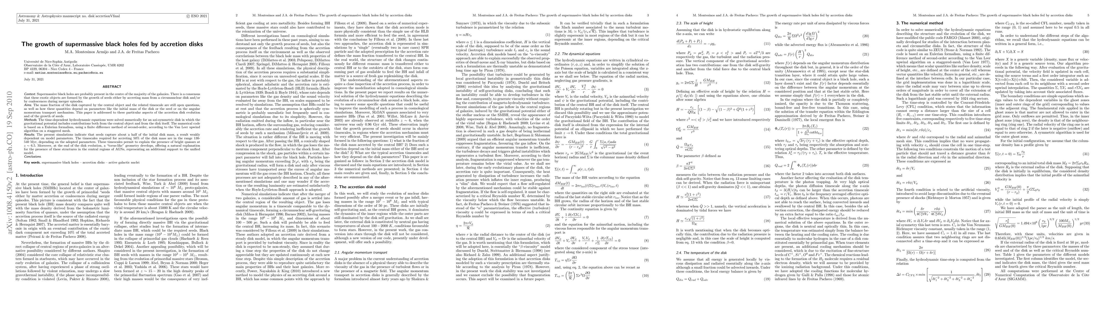 Supermassive black holes are probably present in the centre of the majority of the galaxies. There is a consensus that these exotic objects are formed by the growth of seeds either by accreting mass from a circumnuclear disk and/or by coalescences during merger episodes. The mass fraction of the disk captured by the central object and the related timescale are still open questions, as well as how these quantities depend on parameters like the initial mass of the disk or the seed or on the angular momentum transport mechanism. This paper is addressed to these particular aspects of the accretion disk evolution and of the growth of seeds. The time-dependent hydrodynamic equations were solved numerically for an axi-symmetric disk in which the gravitational potential includes contributions both from the central object and from the disk itself. The numerical code is based on a Eulerian formalism, using a finite difference method of second-order, according to the Van Leer upwind algorithm on a staggered mesh. The present simulations indicate that seeds capture about a half of the initial disk mass, a result weakly dependent on model parameters. The timescales required for accreting 50% of the disk mass are in the range 130-540 Myr, depending on the adopted parameters. These timescales permit to explain the presence of bright quasars at z ~ 6.5. Moreover, at the end of the disk evolution, a "torus-like" geometry develops, offering a natural explanation for the presence of these structures in the central regions of AGNs, representing an additional support to the unified model.