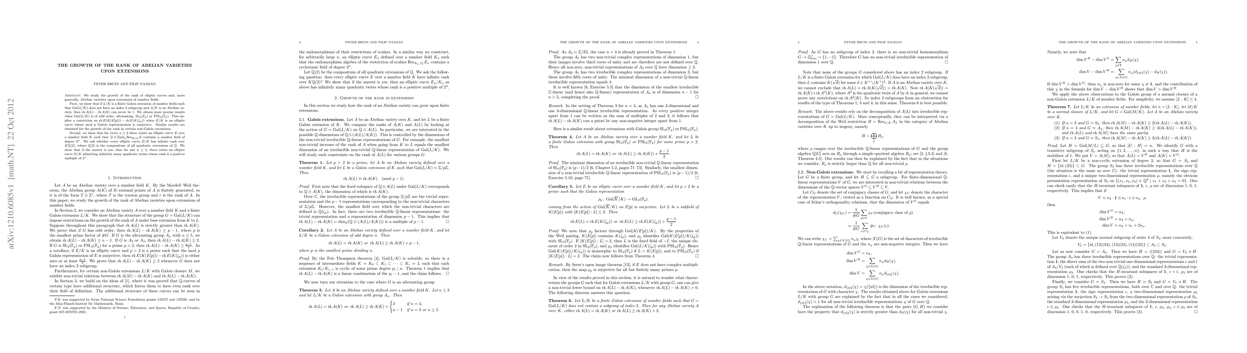 We study the growth of the rank of elliptic curves and, more generally, Abelian varieties upon extensions of number fields. First, we show that if $L/K$ is a finite Galois extension of number fields such that $\Gal(L/K)$ does not have an index 2 subgroup and $A/K$ is an Abelian variety, then $\rk A(L)-\rk A(K)$ can never be 1. We obtain more precise results when $\Gal(L/K)$ is of odd order, alternating, $\SL_2(\F_p)$ or $\PSL_2(\F_p)$. This implies a restriction on $\rk E(K(E[p]))-\rk E(K(\zeta_p))$ when $E/K$ is an elliptic curve whose mod $p$ Galois representation is surjective. Similar results are obtained for the growth of the rank in certain non-Galois extensions. Second, we show that for every $n\ge2$ there exists an elliptic curve $E$ over a number field $K$ such that $\Q\otimes_\Q\Res_{K/\Q} E$ contains a number field of degree $2^n$. We ask whether every elliptic curve $E/K$ has infinite rank over $K\Q(2)$, where $\Q(2)$ is the compositum of all quadratic extensions of $\Q$. We show that if the answer is yes, then for any $n\ge2$, there exists an elliptic curve $E/K$ admitting infinitely many quadratic twists whose rank is a positive multiple of $2^n$.