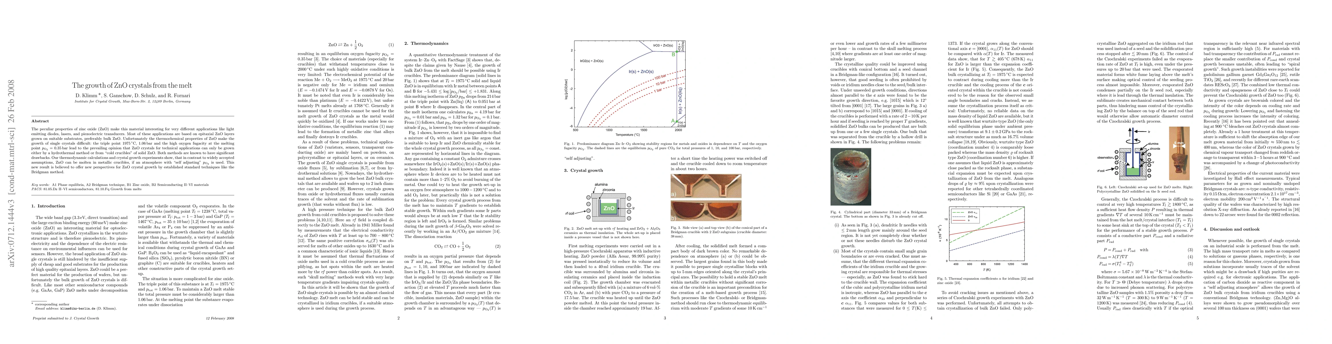 This paper demonstrates that zinc oxide (ZnO) can be grown from the melt in metallic crucibles using a self-adjusting oxygen partial pressure atmosphere, challenging previous methods reliant on hydrothermal or cold crucible techniques. This breakthrough could enhance the growth of ZnO crystals for applications in electronics and optoelectronics.
