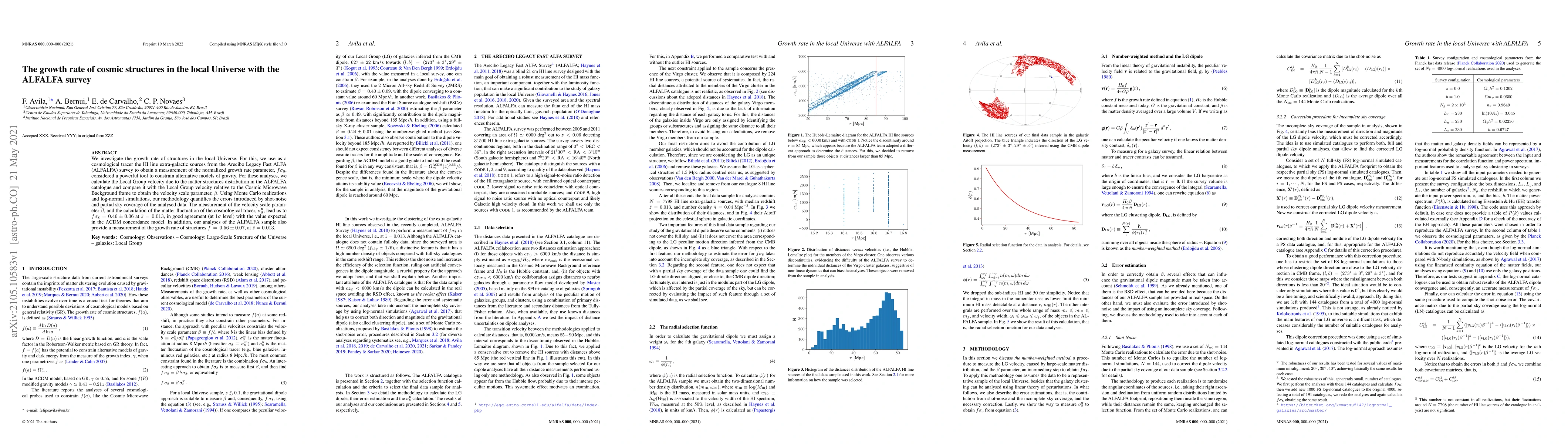 We investigate the growth rate of structures in the local Universe. For this, we use as a cosmological tracer the HI line extra-galactic sources from the Arecibo Legacy Fast ALFA (ALFALFA) survey to obtain a measurement of the normalized growth rate parameter, $f \sigma_{8}$, considered a powerful tool to constrain alternative models of gravity. For these analyses, we calculate the Local Group velocity due to the matter structures distribution in the ALFALFA catalogue and compare it with the Local Group velocity relative to the Cosmic Microwave Background frame to obtain the velocity scale parameter, $\beta$. Using Monte Carlo realizations and log-normal simulations, our methodology quantifies the errors introduced by shot-noise and partial sky coverage of the analysed data. The measurement of the velocity scale parameter $\beta$, and the calculation of the matter fluctuation of the cosmological tracer, $\sigma_{8}^{\text{tr}}$, lead us to $f \sigma_{8} = 0.46 \pm 0.06$ at $\bar{z} = 0.013$, in good agreement (at $1 \sigma$ level) with the value expected in the $\Lambda$CDM concordance model. In addition, our analyses of the ALFALFA sample also provide a measurement of the growth rate of structures $f \,=\, 0.56 \pm 0.07$, at $\bar{z} = 0.013$.