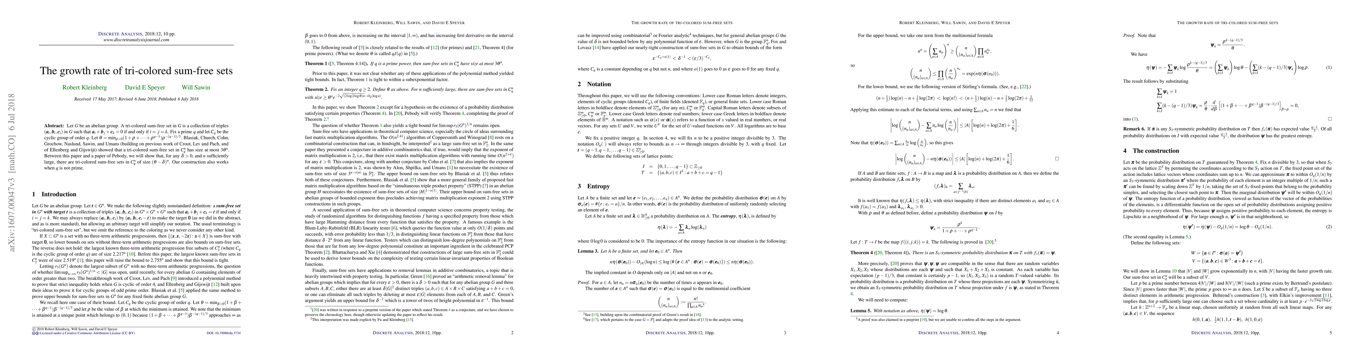 Let $G$ be an abelian group. A tri-colored sum-free set in $G^n$ is a collection of triples $({\bf a}_i, {\bf b}_i, {\bf c}_i)$ in $G^n$ such that ${\bf a}_i+{\bf b}_j+{\bf c}_k=0$ if and only if $i=j=k$. Fix a prime $q$ and let $C_q$ be the cyclic group of order $q$. Let $\theta = \min_{\rho>0} (1+\rho+\cdots + \rho^{q-1}) \rho^{-(q-1)/3}$. Blasiak, Church, Cohn, Grochow, Naslund, Sawin, and Umans (building on previous work of Croot, Lev and Pach, and of Ellenberg and Gijswijt) showed that a tri-colored sum-free set in $C_q^n$ has size at most $3 \theta^n$. Between this paper and a paper of Pebody, we will show that, for any $\delta > 0$, and $n$ sufficiently large, there are tri-colored sum-free sets in $C_q^n$ of size $(\theta-\delta)^n$. Our construction also works when $q$ is not prime.
