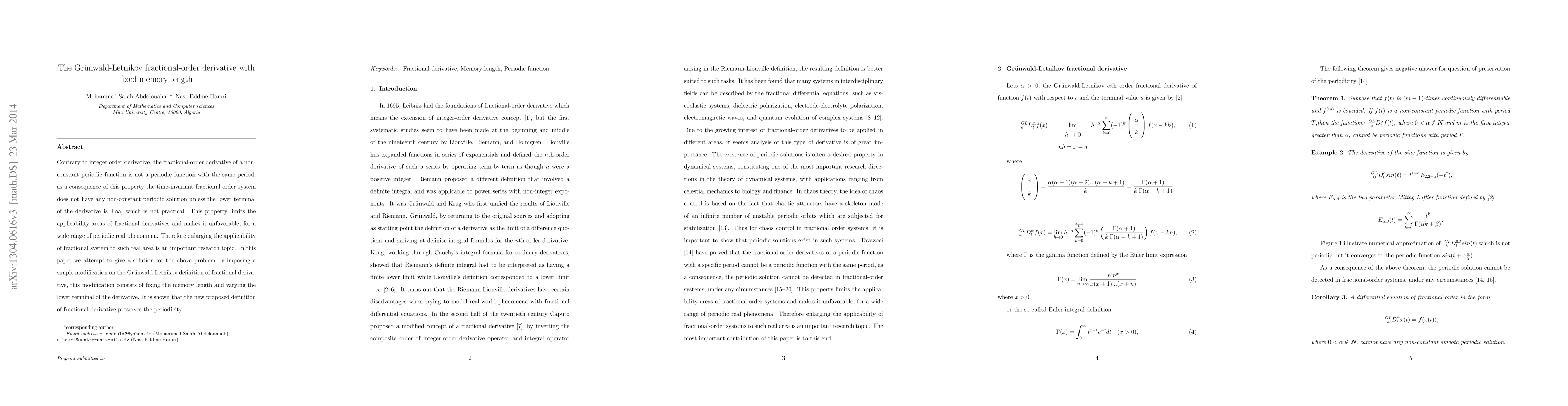 Contrary to integer order derivative, the fractional-order derivative of a non-constant periodic function is not a periodic function with the same period, as a consequence of this property the time-invariant fractional order system does not have any non-constant periodic solution unless the lower terminal of the derivative is plus or minus infinite, which is not practical. This property limits the applicability areas of fractional derivatives and makes it unfavorable, for a wide range of periodic real phenomena. Therefore enlarging the applicability of fractional system to such real area is an important research topic. In this paper we give a solution for the above problem by imposing a simple modification on the Gr\"unwald-Letnikov definition of fractional derivative, this modification consists of fixing the memory length and varying the lower terminal of the derivative. It is shown that the new proposed definition of fractional derivative preserves the periodicity.