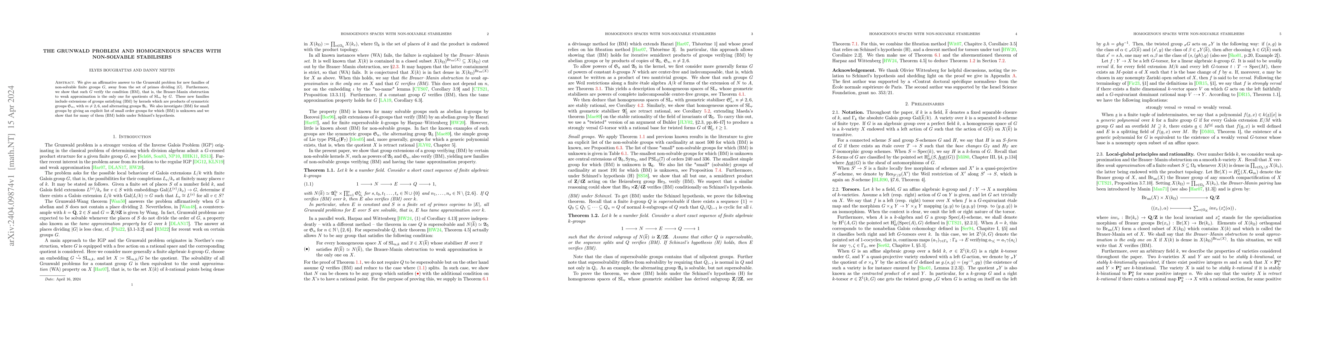 We give an affirmative answer to the Grunwald problem for new families of non-solvable finite groups G, away from the set of primes dividing |G|. Furthermore, we show that such G verify the condition (BM), that is, the Brauer-Manin obstruction to weak approximation is the only one for quotients of SL_n by G. These new families include extensions of groups satisfying (BM) by kernels which are products of symmetric groups S_m, with $m\neq 2,6$, and alternating groups A_5. We also investigate (BM) for small groups by giving an explicit list of small order groups for which (BM) is unknown and we show that for many of them (BM) holds under Schinzel's hypothesis.