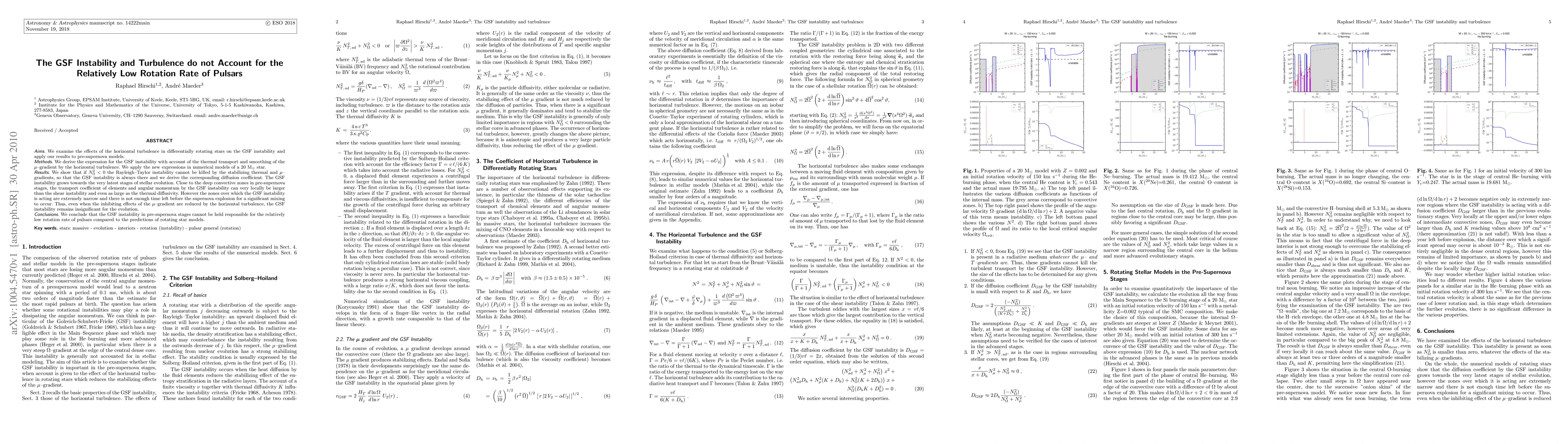 This paper investigates the GSF instability and horizontal turbulence in differentially rotating stars, finding that the GSF instability cannot be sufficiently mitigated to explain the relatively low rotation rates of pulsars. The study concludes that the GSF instability remains insignificant in pre-supernova stages despite its potential local effects.