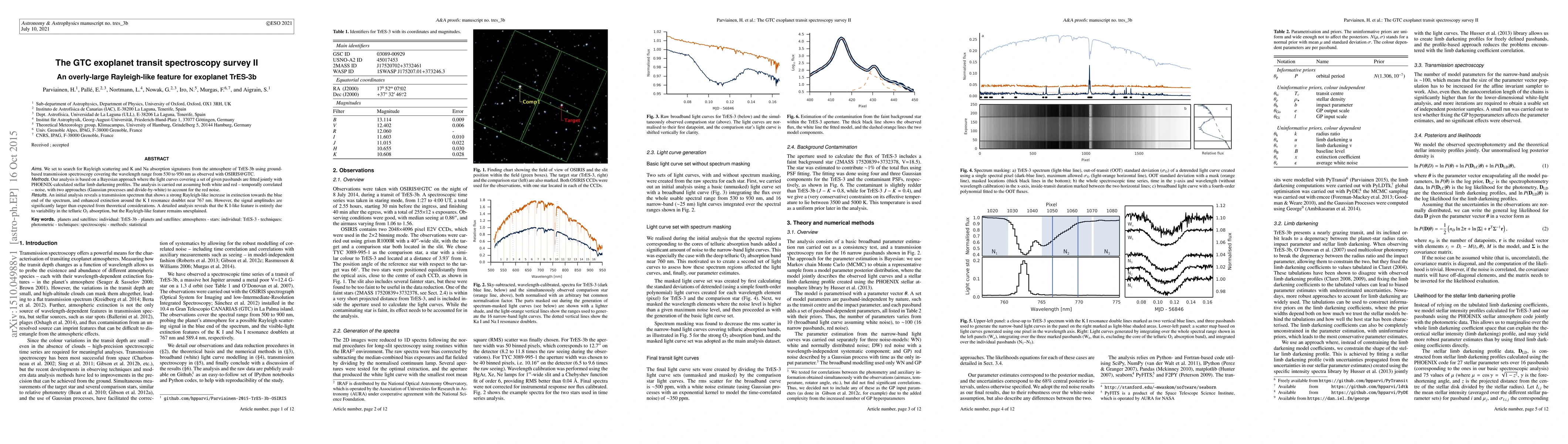 We set to search for Rayleigh scattering and K and Na absorption signatures from the atmosphere of TrES-3b using ground-based transmission spectroscopy covering the wavelength range from 530 to 950 nm as observed with OSIRIS@GTC. Our analysis is based on a Bayesian approach where the light curves covering a set of given passbands are fitted jointly with PHOENIX-calculated stellar limb darkening profiles. The analysis is carried out assuming both white and red -- temporally correlated -- noise, with two approaches (Gaussian processes and divide-by-white) to account for the red noise. An initial analysis reveals a transmission spectrum that shows a strong Rayleigh-like increase in extinction towards the blue end of the spectrum, and enhanced extinction around the K I resonance doublet near 767 nm. However, the signal amplitudes are significantly larger than expected from theoretical considerations. A detailed analysis reveals that the K I-like feature is entirely due to variability in the telluric O$_2$ absorption, but the Rayleigh-like feature remains unexplained.