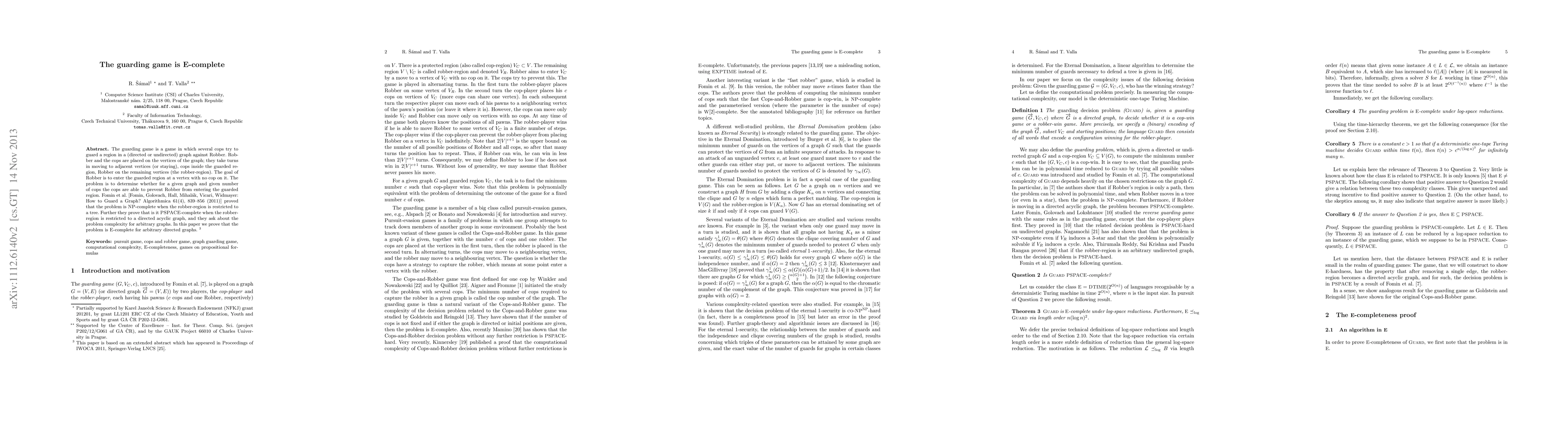 The guarding game is a game in which several cops try to guard a region in a (directed or undirected) graph against Robber. Robber and the cops are placed on the vertices of the graph; they take turns in moving to adjacent vertices (or staying), cops inside the guarded region, Robber on the remaining vertices (the robber-region). The goal of Robber is to enter the guarded region at a vertex with no cop on it. The problem is to determine whether for a given graph and given number of cops the cops are able to prevent Robber from entering the guarded region. Fomin et al. [Fomin, Golovach, Hall, Mihalak, Vicari, Widmayer: How to Guard a Graph? Algorithmica 61(4), 839--856 (2011)] proved that the problem is NP-complete when the robber-region is restricted to a tree. Further they prove that is it PSPACE-complete when the robber-region is restricted to a directed acyclic graph, and they ask about the problem complexity for arbitrary graphs. In this paper we prove that the problem is E-complete for arbitrary directed graphs.