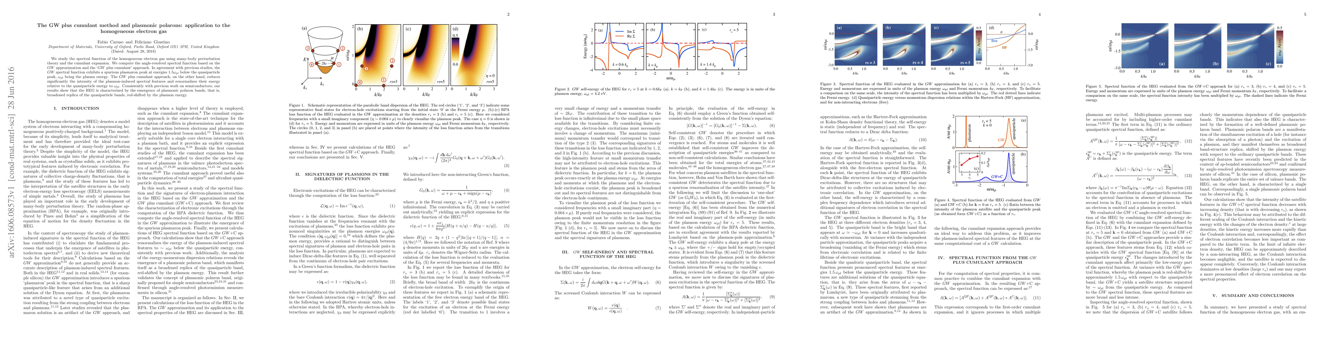 This paper applies the GW plus cumulant method to the homogeneous electron gas, revealing that it reduces spurious plasmonic features compared to the GW approximation alone. The GW plus cumulant approach also renormalizes plasmon-induced spectral features to the plasma energy, showing the emergence of plasmonic polaron bands.