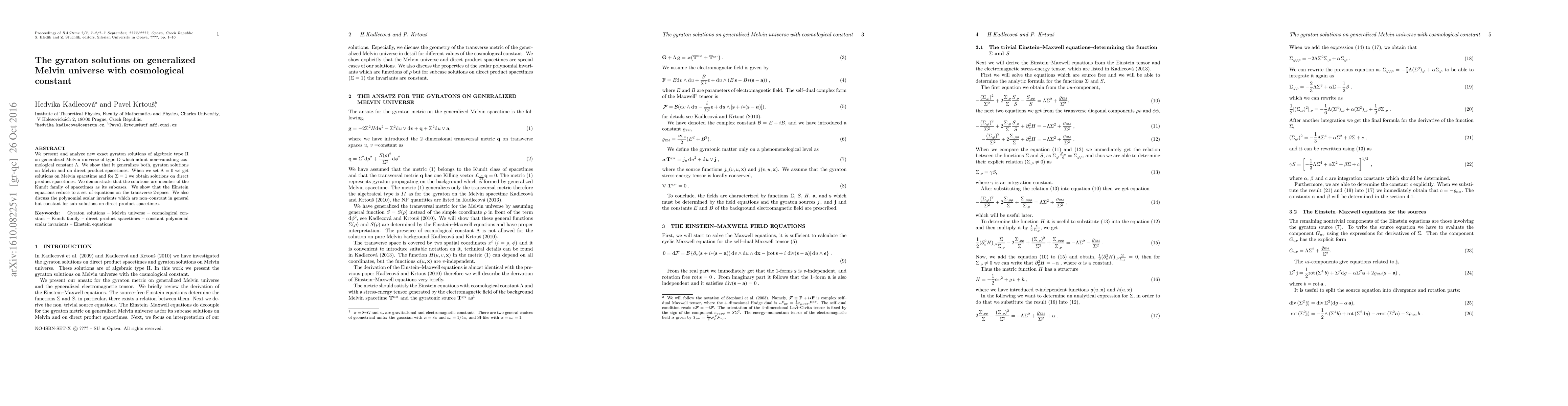 The paper presents new exact gyraton solutions on generalized Melvin universe with cosmological constant, showing they generalize both Melvin and direct product spacetimes.