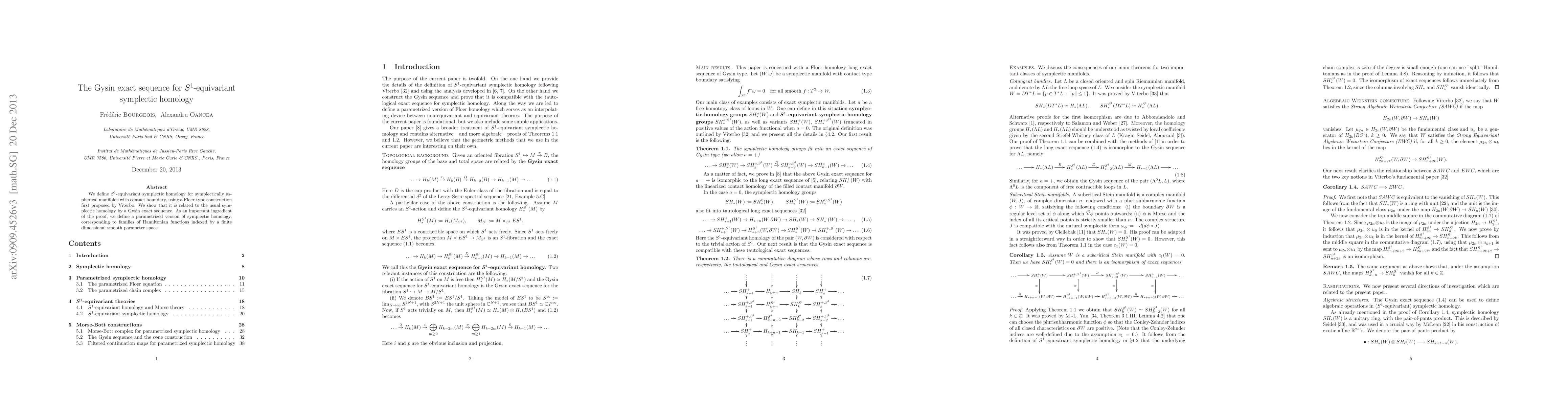 This paper introduces $S^1$-equivariant symplectic homology for symplectically aspherical manifolds with contact boundary, demonstrating its relationship with usual symplectic homology via a Gysin exact sequence, aided by a parametrized version of symplectic homology.