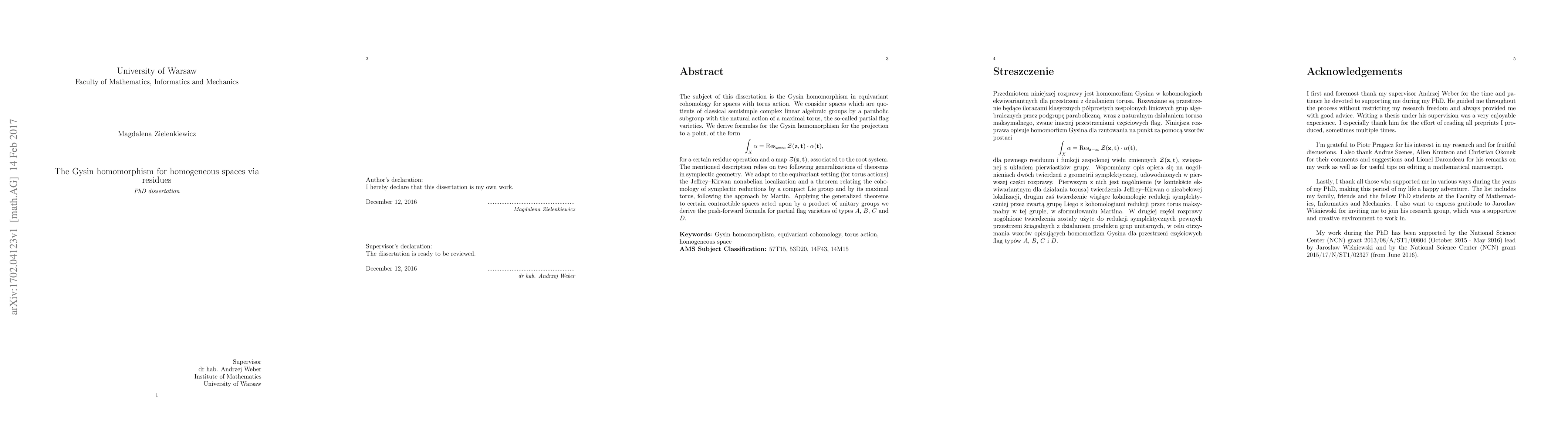 The subject of this dissertation is the Gysin homomorphism in equivariant cohomology for spaces with torus action. We consider spaces which are quotients of classical semisimple complex linear algebraic groups by a parabolic subgroup with the natural action of a maximal torus, the so-called partial flag varieties. We derive formulas for the Gysin homomorphism for the projection to a point, of the form \[\int_X \alpha = Res_{\mathbf{z}=\infty} \mathcal{Z}(\mathbf{z}, \mathbf{t}) \cdot \alpha(\mathbf{t}),\] for a certain residue operation and a map $\mathcal{Z}(\mathbf{z}, \mathbf{t})$, associated to the root system. The mentioned description relies on two following generalizations of theorems in symplectic geometry. We adapt to the equivariant setting (for torus actions) the Jeffrey--Kirwan nonabelian localization and a theorem relating the cohomology of symplectic reductions by a compact Lie group and by its maximal torus, following the approach by Martin. Applying the generalized theorems to certain contractible spaces acted upon by a product of unitary groups we derive the push-forward formula for partial flag varieties of types $A$, $B$, $C$ and $D$.