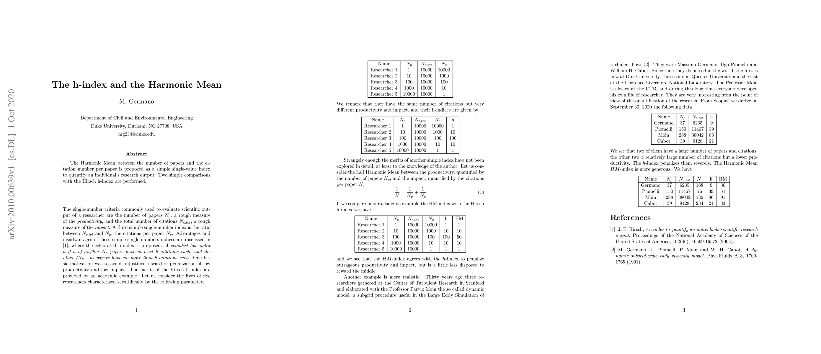 This paper proposes the Harmonic Mean of papers and citations per paper as a simple index to measure research output, comparing it with the Hirsch h-index.
