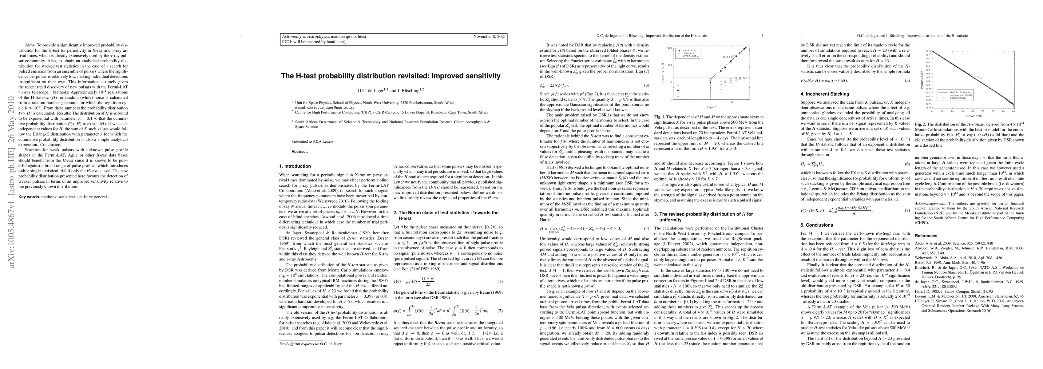 Aims: To provide a significantly improved probability distribution for the H-test for periodicity in X-ray and $\gamma$-ray arrival times, which is already extensively used by the $\gamma$-ray pulsar community. Also, to obtain an analytical probability distribution for stacked test statistics in the case of a search for pulsed emission from an ensemble of pulsars where the significance per pulsar is relatively low, making individual detections insignificant on their own. This information is timely given the recent rapid discovery of new pulsars with the Fermi-LAT t $\gamma$-ray telescope. Methods: Approximately $10^{14}$ realisations of the H-statistic ($H$) for random (white) noise is calculated from a random number generator for which the repitition cycle is $\gg 10^{14}$. From these numbers the probability distribution $P(>H)$ is calculated. Results: The distribution of $H$ is is found to be exponential with parameter $\lambda=0.4$ so that the cumulative probability distribution $P(>H)=\exp{(-\lambda H)}$. If we stack independent values for $H$, the sum of $K$ such values would follow the Erlang-K distribution with parameter $\lambda$ for which the cumulative probability distribution is also a simple analytical expression. Conclusion: Searches for weak pulsars with unknown pulse profile shapes in the Fermi-LAT, Agile or other X-ray data bases should benefit from the {\it H-test} since it is known to be powerful against a broad range of pulse profiles, which introduces only a single statistical trial if only the {\it H-test} is used. The new probability distribution presented here favours the detection of weaker pulsars in terms of an improved sensitivity relative to the previously known distribution.