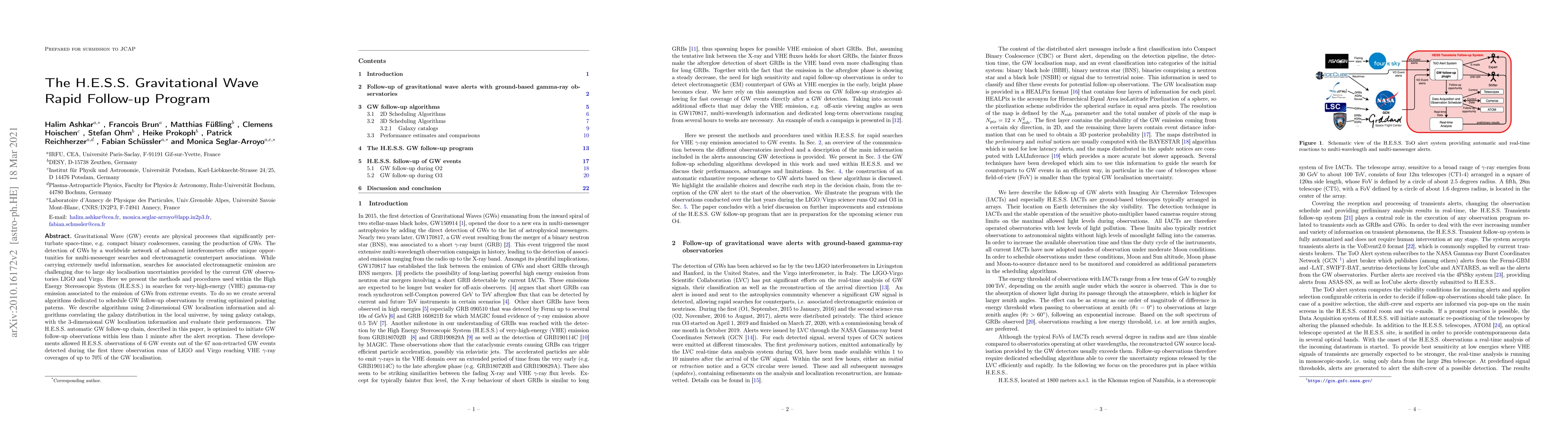 The H.E.S.S. Gravitational Wave Rapid Follow-up Program outlines methods for detecting very-high-energy gamma-ray emissions associated with gravitational wave events, employing optimized algorithms to initiate observations within a minute of alerts. The program achieved VHE gamma-ray coverages of up to 70% for 6 out of 67 detected GW events.
