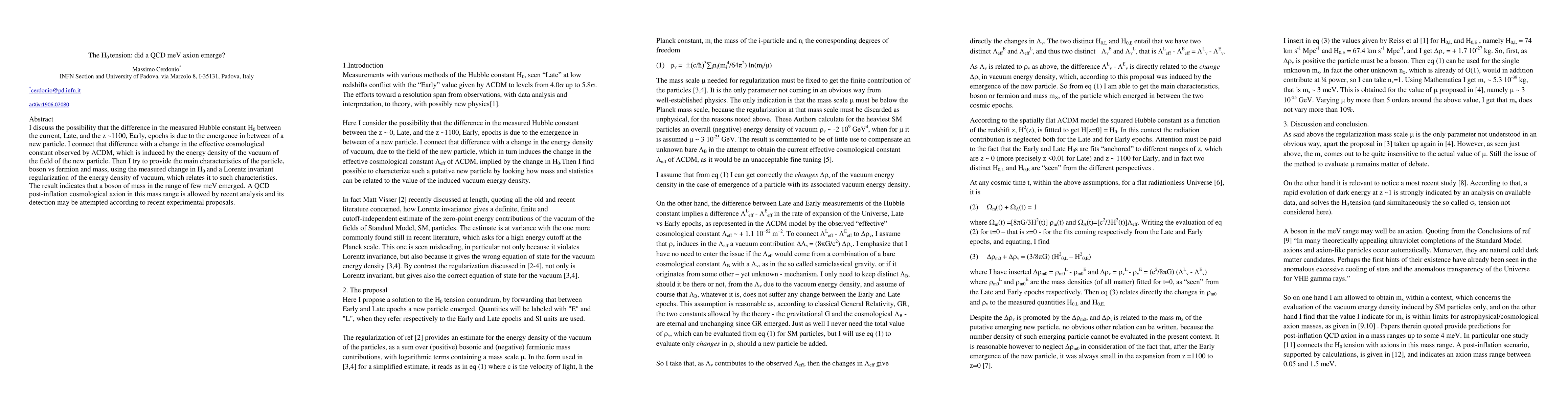 I discuss the possibility that the difference in the measured Hubble constant Ho between the current, Late, and the z ~1100, Early, epochs is due to the emergence in between of a new particle. I connect that difference with a change in the effective cosmological constant observed by LambdaCDM, which is induced by the energy density of the vacuum of the field of the new particle. Then I try to provide the main characteristics of the particle, boson vs fermion and mass, using the measured change in Ho and a Lorentz invariant regularization of the energy density of vacuum, which relates it to such characteristics. The result indicates that a boson of mass in the range of few meV emerged. A QCD post-inflation cosmological axion in this mass range is allowed by recent analysis and its detection may be attempted according to recent experimental proposals.