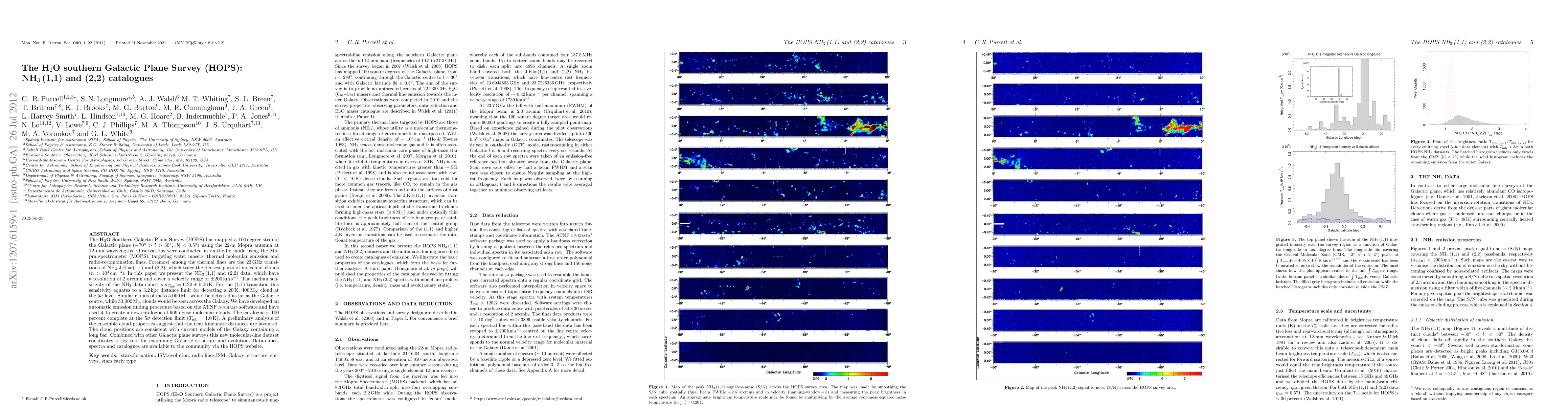 The H2O Southern Galactic Plane Survey (HOPS) has mapped a 100 degree strip of the Galactic plane (-70deg > l > 30deg, |b| < 0.5deg) using the 22-m Mopra antenna at 12-mm wavelengths. Observations were conducted in on-the-fly mode using the Mopra spectrometer (MOPS), targeting water masers, thermal molecular emission and radio-recombination lines. Foremost among the thermal lines are the 23 GHz transitions of NH3 J,K = (1,1) and (2,2), which trace the densest parts of molecular clouds (n > 10^4 cm^{-3}). In this paper we present the NH3 (1,1) and (2,2) data, which have a resolution of 2 arcmin and cover a velocity range of +/-200 km/s. The median sensitivity of the NH3 data-cubes is sigma_Tmb = 0.20 +/1 0.06 K. For the (1,1) transition this sensitivity equates to a 3.2 kpc distance limit for detecting a 20 K, 400 Msun cloud at the 5-sigma level. Similar clouds of mass 5,000 Msun would be detected as far as the Galactic centre, while 30,000 Msun clouds would be seen across the Galaxy. We have developed an automatic emission finding procedure based on the ATNF DUCHAMP software and have used it to create a new catalogue of 669 dense molecular clouds. The catalogue is 100 percent complete at the 5-sigma detection limit (Tmb = 1.0 K). A preliminary analysis of the ensemble cloud properties suggest that the near kinematic distances are favoured. The cloud positions are consistent with current models of the Galaxy containing a long bar. Combined with other Galactic plane surveys this new molecular-line dataset constitutes a key tool for examining Galactic structure and evolution. Data-cubes, spectra and catalogues are available to the community via the HOPS website.