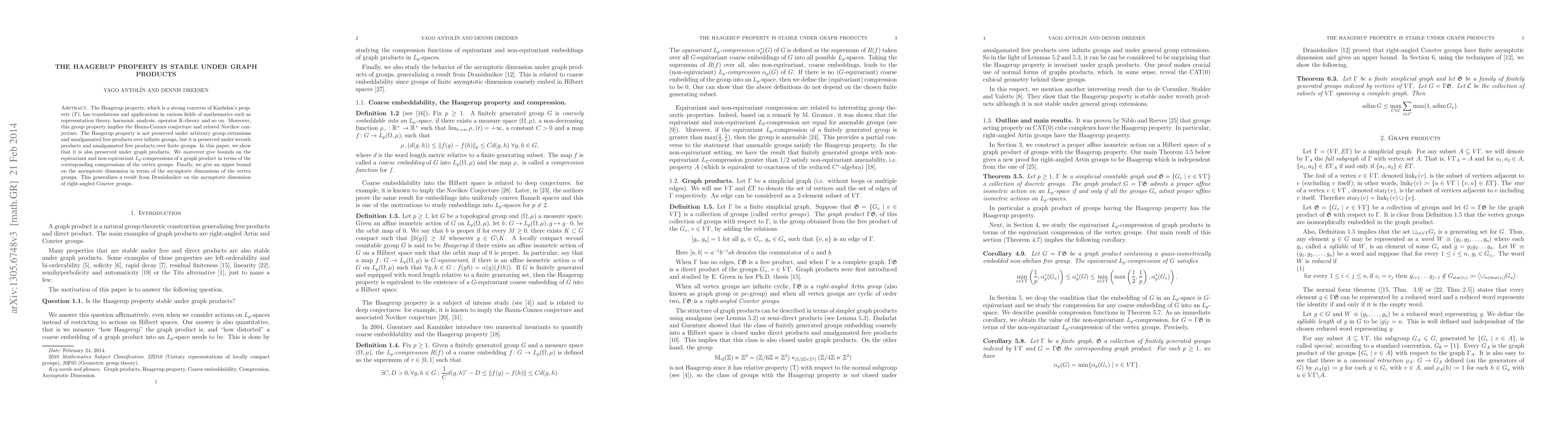 This paper demonstrates that the Haagerup property, a significant group property linked to the Baum-Connes and Novikov conjectures, is preserved under graph products. It also provides bounds for $L_p$-compressions and asymptotic dimension for graph products in terms of their vertex groups.