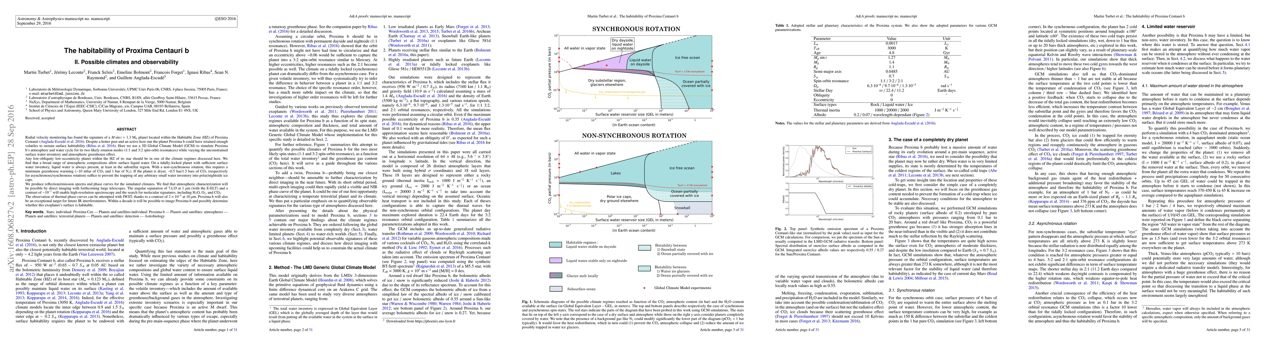 This paper uses a 3D Global Climate Model to simulate the climates of Proxima Centauri b under different rotation modes and atmospheric conditions, finding that a broad range of compositions can sustain surface liquid water. Direct imaging with future large telescopes will allow atmospheric characterization, including the search for molecular signatures of habitability.